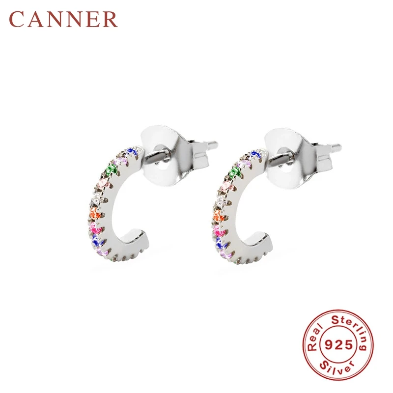 Простой Циркон в один ряд c-тип мини серьги-гвоздики для женщин из стерлингового серебра 925 пробы с радужным кристаллом маленькие серьги Модные ювелирные изделия