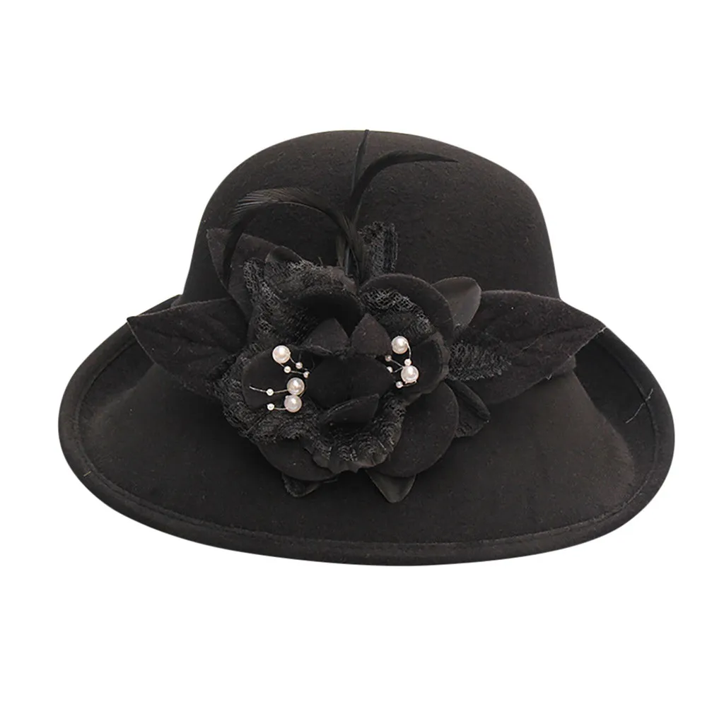 Мода женщин Твердые Перья цветок жемчуг керлинг формальная шляпа шерсть шляпа Кепка