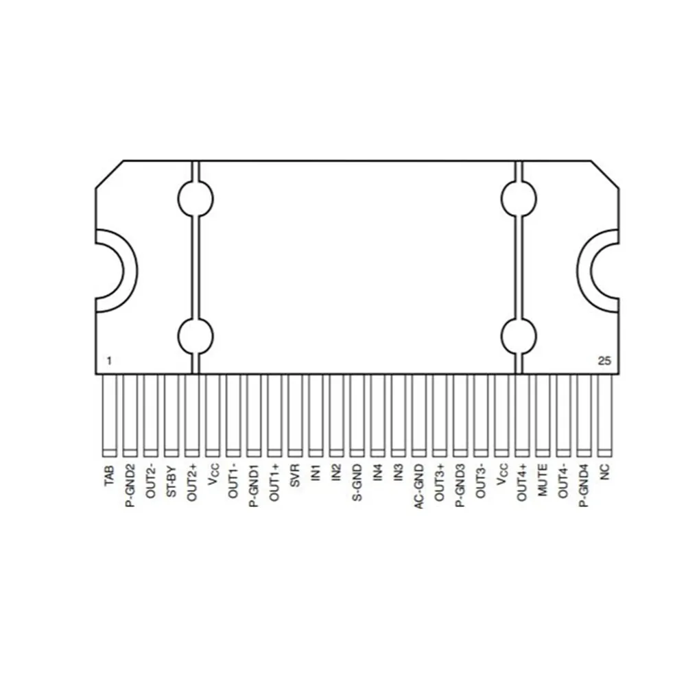 Введение TDA7388 представляет собой аудио усилитель мощности класса AB, упакованный в Flexiwatt 25 и предназначен для высококлассных автомобильных радиоприемников. На основе полностью дополняющей конфигурации PNP/NPN, TDA7388 позволяет рельсу к выходному напряжению качаться без необходимости bootstrapконденсаторов. Чрезвычайно уменьшенные гравитационные компоненты позволяют очень компактные наборы. Характеристика Высокая Выходная мощность: 4 × 45 Вт/4 Ом макс. 4 × 26W14 Ом @ 14,4 В, 1 кГц, 10% Низкое Искажение Низкий выход noiseStandby Функция отключения звука Автоматическая функция при мин. Обнаружение напряжения питания Низкий коэффициент внешнего компонента: внутренний фиксированный коэффициент усиления (26 дБ) нет Внешняя компенсация без конденсаторов bootstrap
