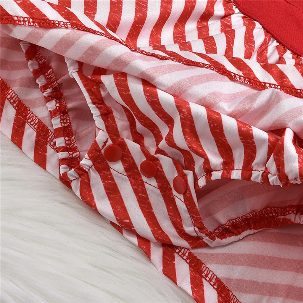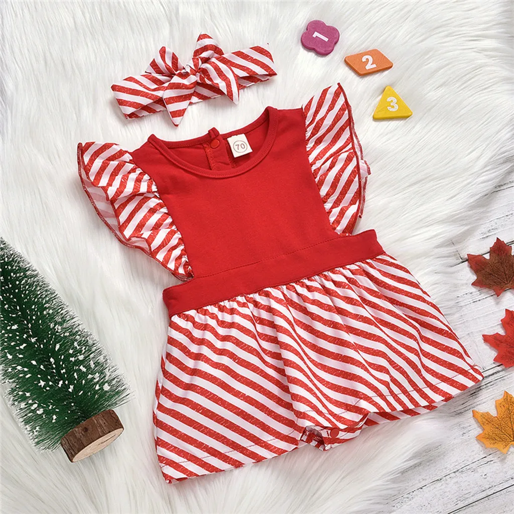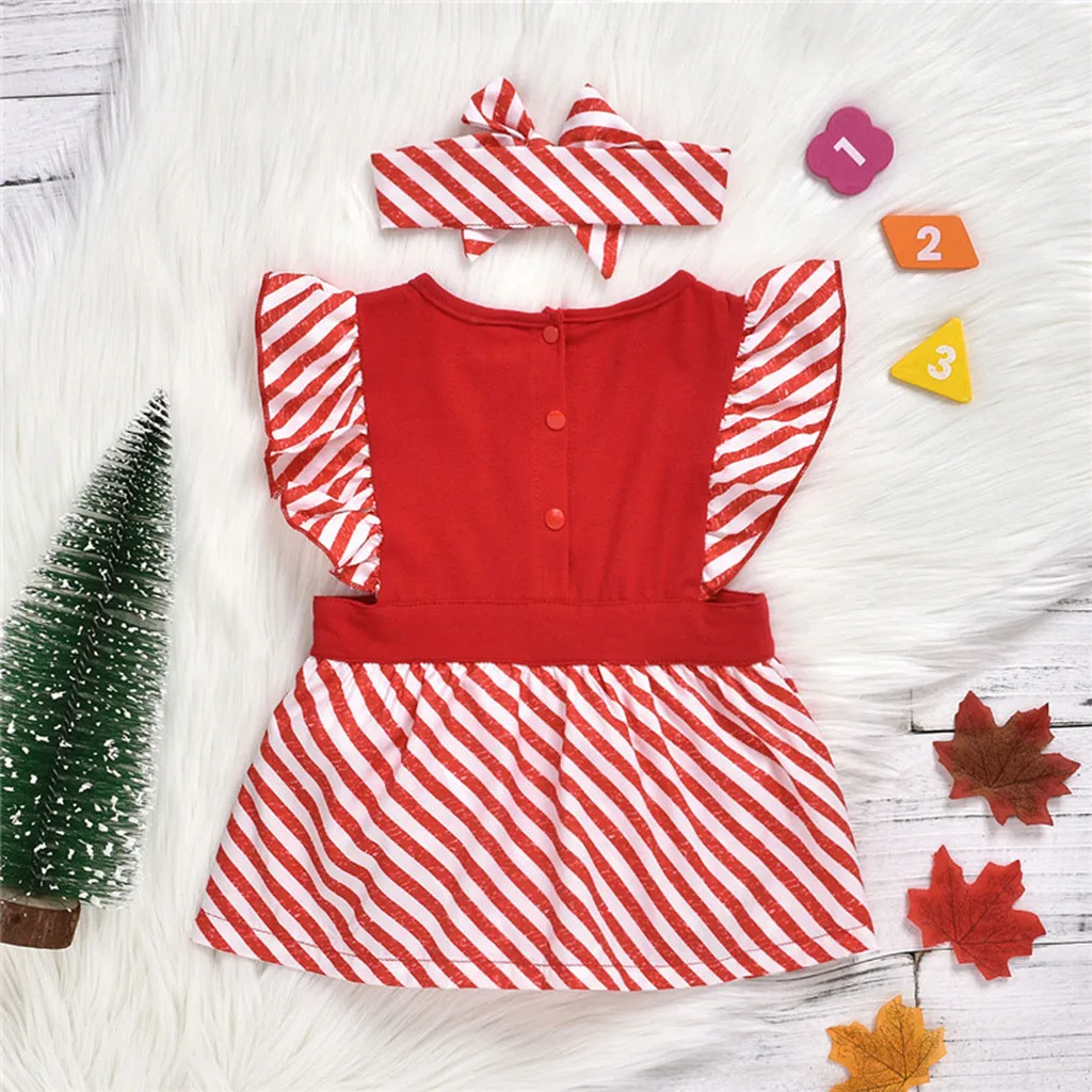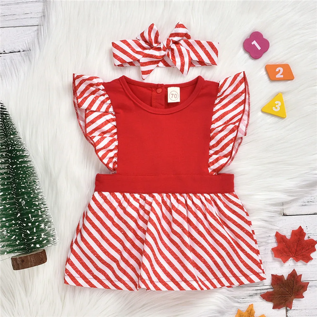 Детское платье в красную полоску с короткими рукавами, круглым воротником и пуговицами; головной убор с бантом