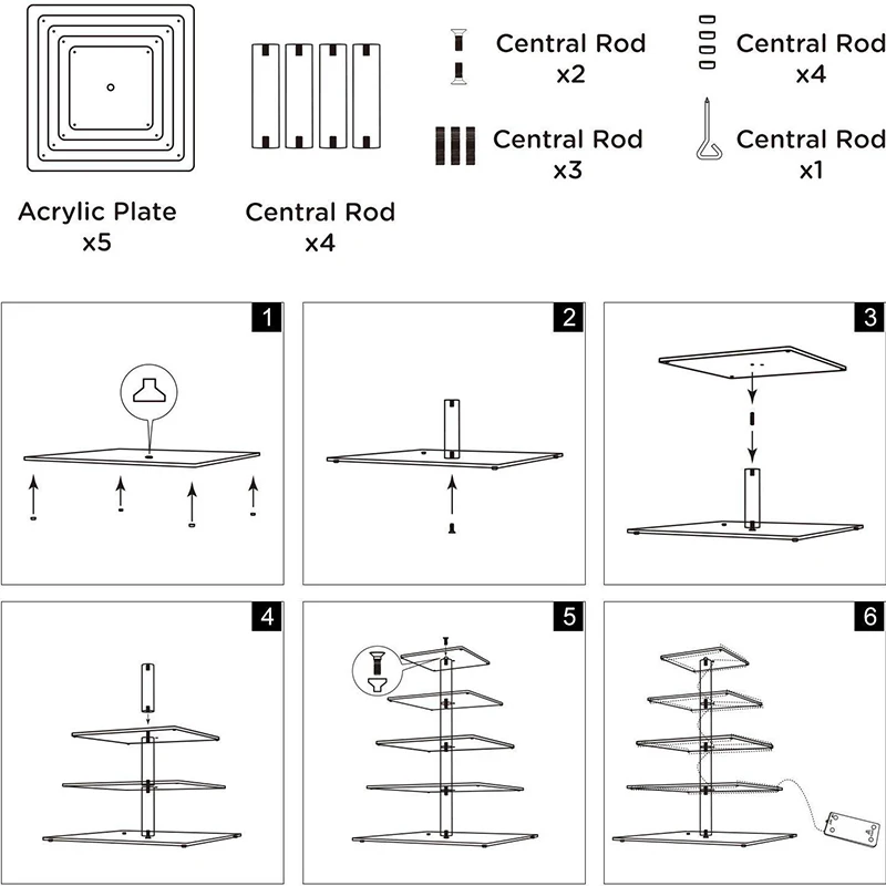 * Detachability и универсальность: может быть разобран в качестве одного из 5-ти слойной, 4-секционный измельчитель для специй, 3-х слойные или 2-х слойный стенд кекса, каждый акриловая доска может быть свободно собрать и мыть