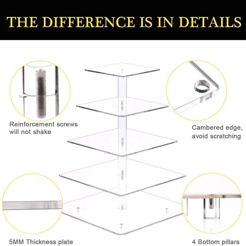 * Стабильность: торт сделан вертикально и стабильно, используя акриловые стержни с винтами вместо труб. Каждый акриловый стержень имеет медную гайку, встроенную в середину, которая может идеально защитить стержень от повреждения после повторного использования