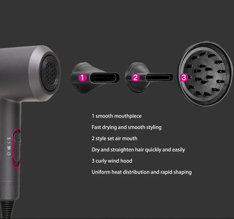 Складная ручка не складывается Шестерня управления скоростью 3 Тип Насадки: коллектор + Диффузор Функция: анион, холодный и горячий воздух, Ион тонкой воды, постоянная температура Защита от перегрева да Номинальное напряжение: 220-240 (В) Номинальная мощность: 2000 Вт и выше (Вт) Двигатель: прецизионный двигатель переменного тока Усовершенствованная u-волновая конструкция нагревательного провода