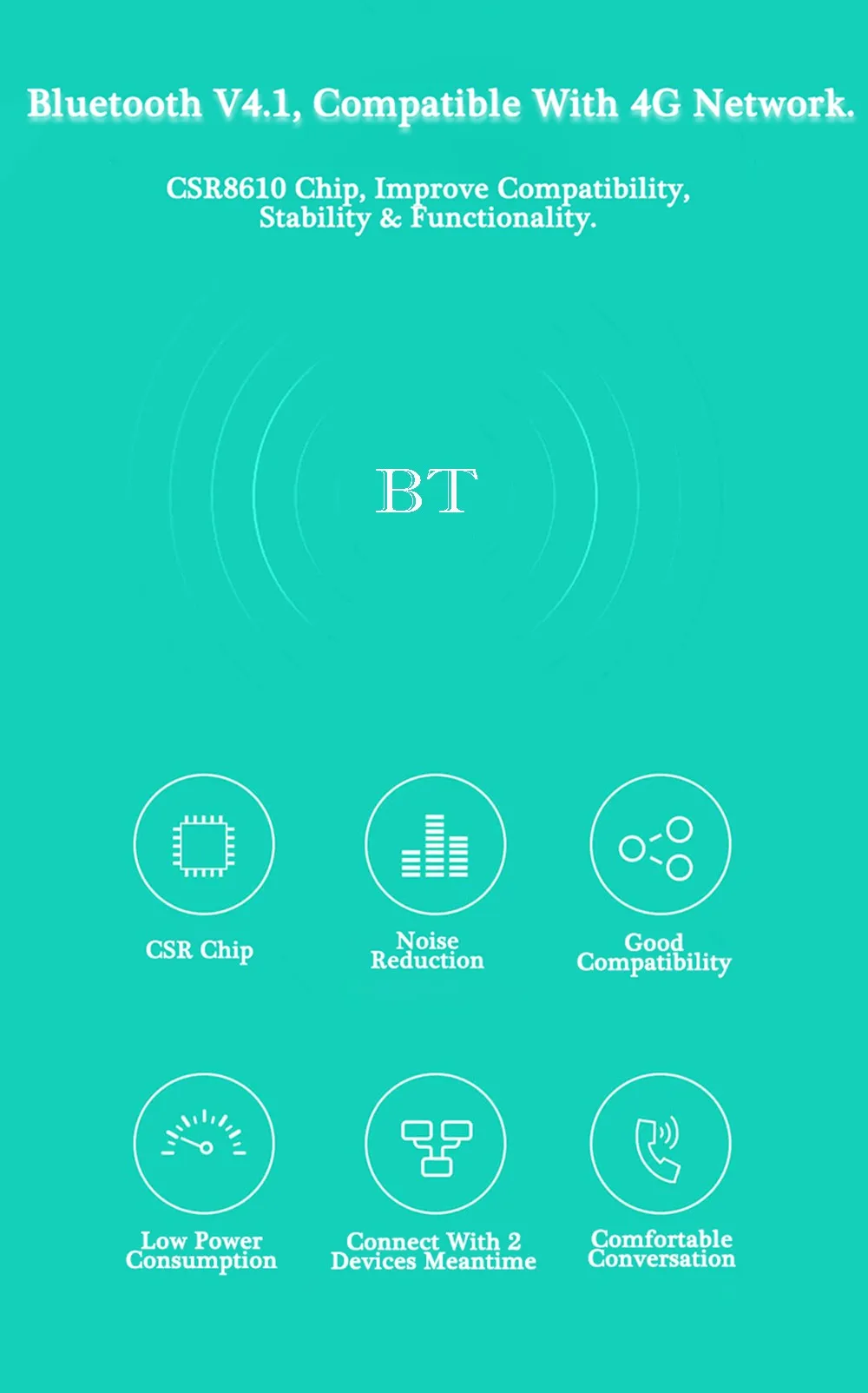 -Bluetooth 4,1, совместим с 4G сетью, чип CSR 8610, улучшает совместимость, стабильность и функциональность