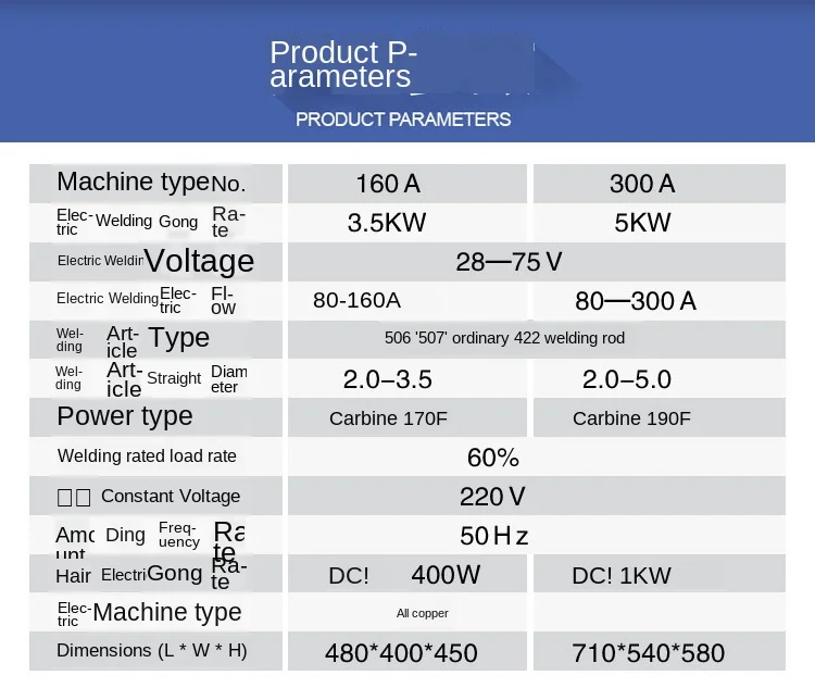 A. Сварка: 80 ~ 160A этот аппарат может использовать обычный сварочный стержень диаметр: 2,0-3,2, 80 ~ 300A этот аппарат может использовать обычный сварочный стержень Диаметр: 2,0-5,0, тип сварочного стержня, 506'507' обычный 422 сварочный стержень. Номинальная скорость нагрузки сварочного аппарата составляет 60% и не может быть перегрузки.