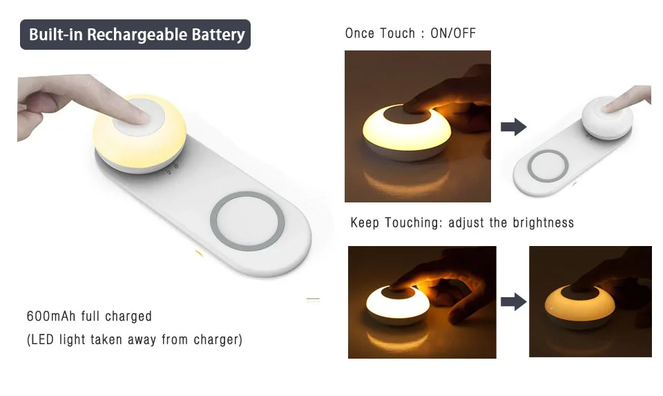 enabled phone Input : 5V/2A 9V/2A Output : 5V/5W MAX 9V/10W MAX Transmission distance : <4mm Color Temperature : 3000k Working Temperature : -10 °C- 40 °C Produce size : 215*80*45mm Battery capacity : 600mAh Lumen : 2-18LM