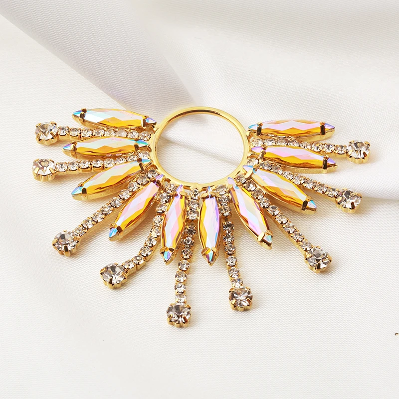 2)-покрытие и материал: золотое основание + стеклянные хрустальные стразы + полимерный кристалл AB камень + сплав