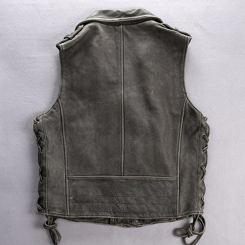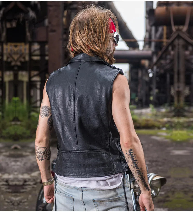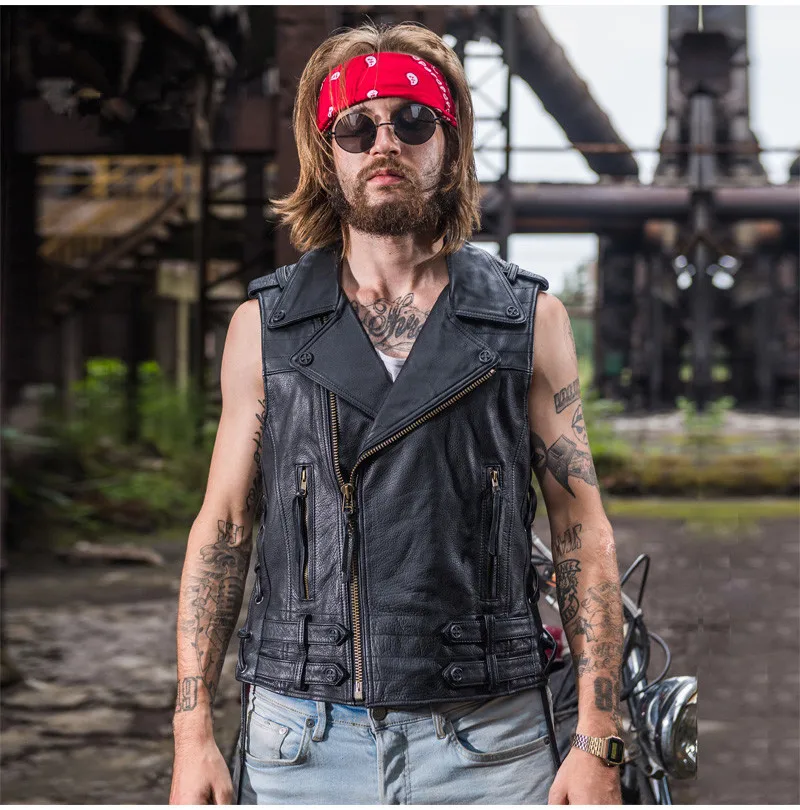 Байкерский жилет из натуральной воловьей кожи с отворотом на молнии, регулируемый жилет из натуральной кожи, мотоциклетная куртка без рукавов в стиле панк