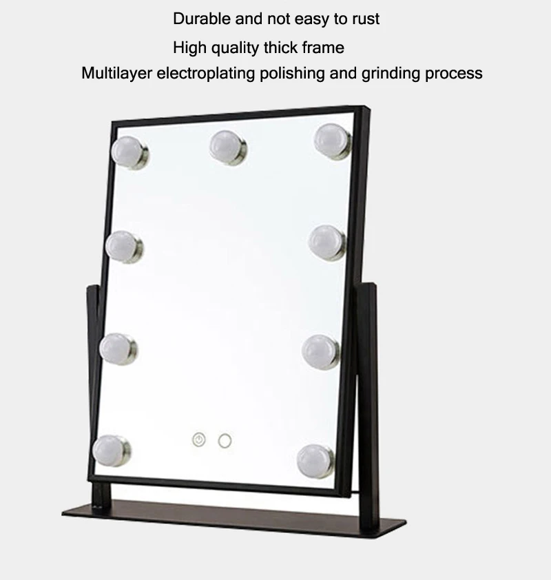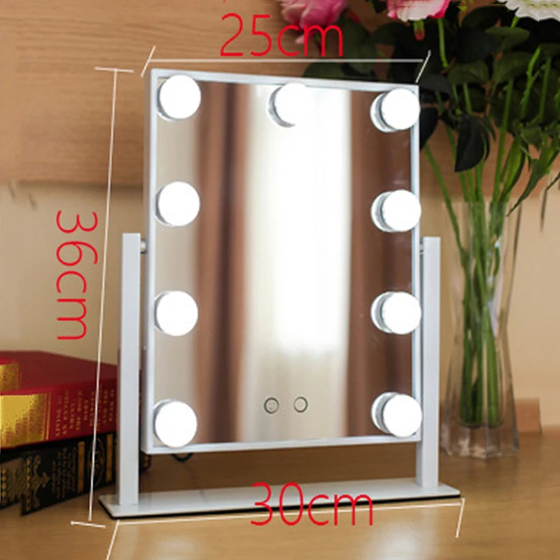 Категория продукта: настольное зеркало Материал оправы: металл Особенности: вращение на 360 градусов, поверхность с увеличительным стеклом в 3 раза, нескользящая основа, не подвержена ржавчине Размер изделия: 30*36*8 см Рама: 25*30 см Напряжение: 110-220 В (стиль штепсельной вилки) Лампа: 9*3 Вт светодиодный светильник