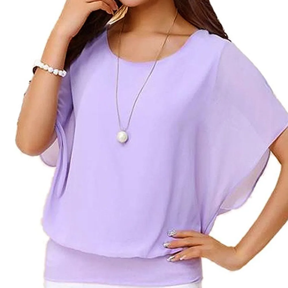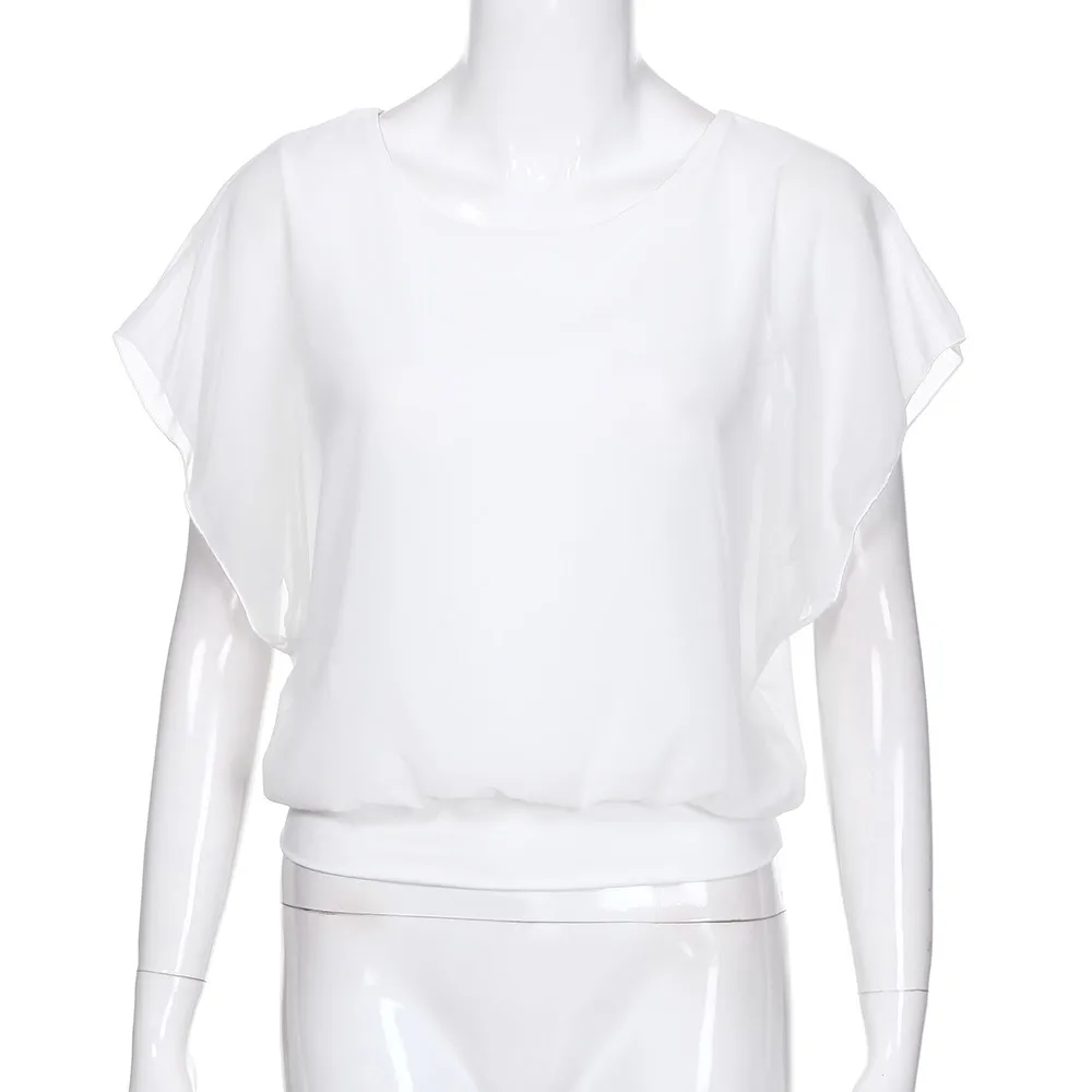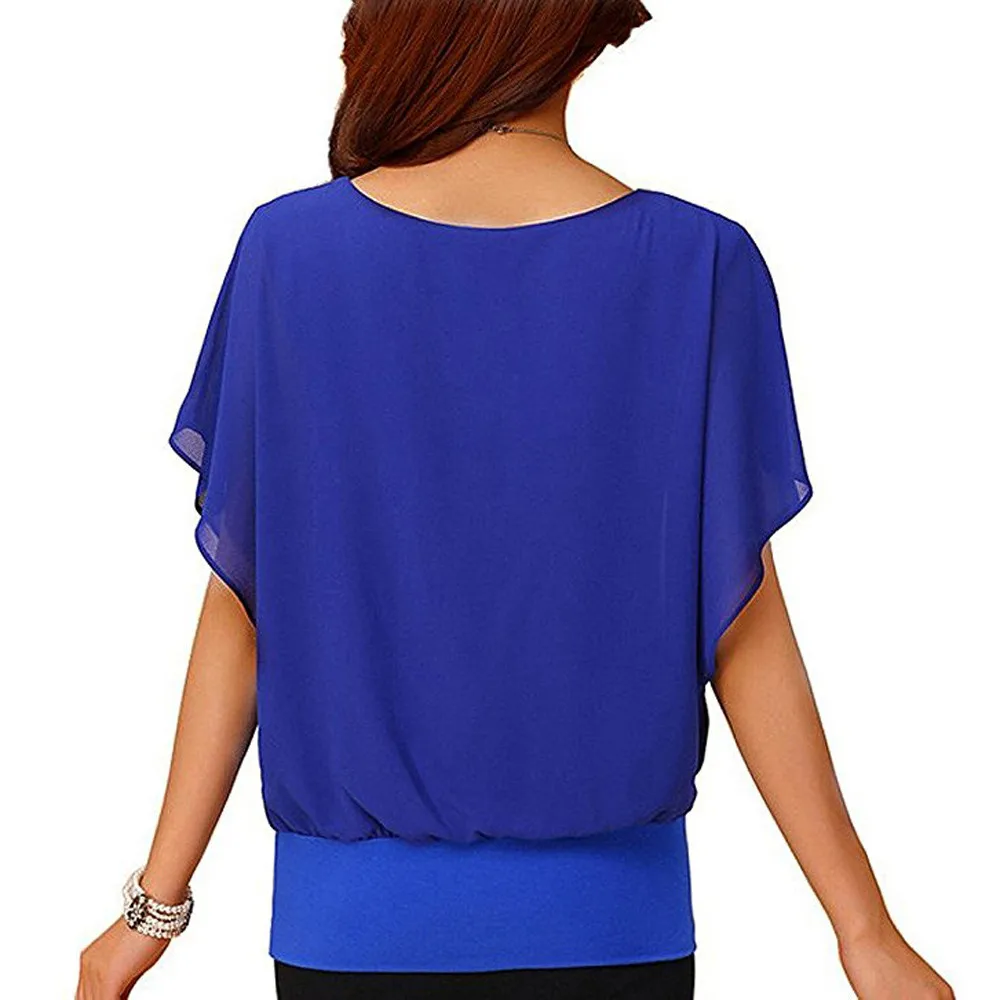 Повседневная шифоновая футболка с короткими рукавами с рукавом «летучая мышь». Очень круто и модно носить на улице, специально для летнего пляжного музыкального фестиваля. Лучше всего сочетать его с шортами и босоножками-гладиаторами.