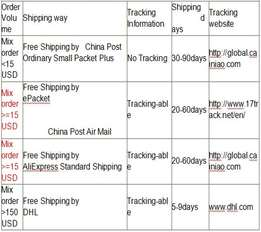Доставка, например: Экономичный или Почта Китая обычный маленький пакет плюс бесплатная доставка США: 10-20 рабочих дней. Страны ЕС и азиатские страны 15-25 рабочих дней. Русские земли и страны, расположенные в пределах 25-55 дней. Южная Америка 25-45 дней. EPacket: США/Канада/Австралия: 7-20 дней. Украина/Российская Федерация: 18-24 дней AliExpress Стандартная доставка: Страны ЕС и азиатские страны: 11-14 дней Русская земля и страны, расположенные рядом: 18-22 дней. Авиа-отправление Почты Китая: Страны ЕС и азиатские страны: 14-22 дня Страны Южной Америки 30-39 дней.