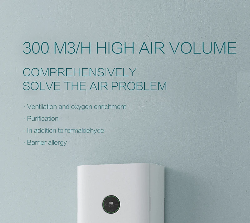 Название: стиль свежего воздуха Мощность: 800 Вт Эффективность очистки: более 99.9% Функция 1: очистка от дымки Функция 2: дезодорирование Функция 3: интеллектуальное управление 300 м³/ч большой объем воздуха Комплексное решение проблемы с воздухом Очистка вентиляции и кислорода В дополнение к формальдегидебарьерной аллергии