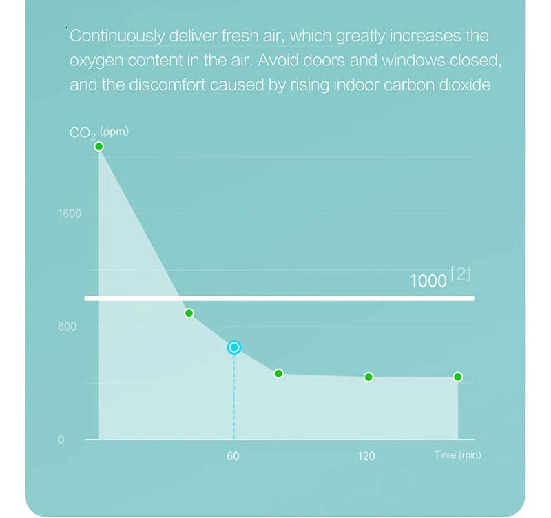 Быстрое уменьшение coß концентрации Эффективное удаление PM2.5 Уменьшение аллергенов Удаление формальдегида 60 минут уменьшение углекислого газа 70.3% непрерывный поток свежего воздуха, и таблица концентрации углекислого газа ниже 500 ppm.