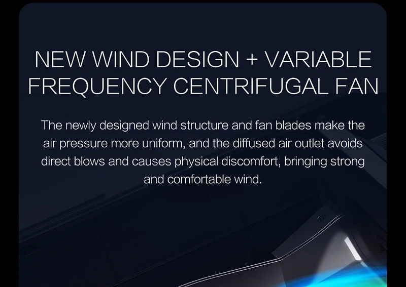 Новый дизайн ветра + вариабельный центробежный вентилятор Недавно разработанная ветровая структура и лопасти вентилятора делают давление воздуха более равномерным, а диффузное воздушное отверстие позволяет избежать прямых ударов и вызывает физический дискомфорт, обеспечивая сильный и комфортный ветер.