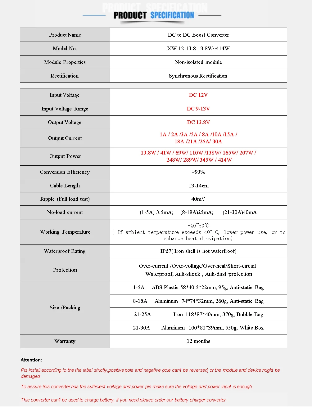 Модель № XW-12-13.8-13.8W ~ 414 Вт Свойства модуля неизолированный модуль Входное напряжение 12 В постоянного тока Диапазон входного напряжения 9-13 В постоянного тока Выходное напряжение 13,8 В постоянного тока Выходной ток 1A / 2A /3A /5A / 8A /10A /15A /18A /21A /25A/ 30A Выходная мощность 13,8 Вт/41 Вт/69 Вт/110 Вт/138 Вт/165 Вт/207 Вт/248 Вт/289 Вт/345 Вт/414 Вт КПД преобразования> 93% Пульсация (тест на полную нагрузку) 40 мВ Ток холостого хода (1-5A) 3,5 мА; (8-18A)25 мА; (21-30A)40 мА Рабочая температура-40 ~ 80 ℃ Класс водонепроницаемости IP67 (железная оболочка не является водонепроницаемой) Размер/Упаковка 1-5 а АБС-пластик 58*40,5*22 мм, 95 г, антистатический пакет 8-18A алюминий 74*74*32 мм, 260 г, Антистатический мешок Железный 118*87*40 мм, 370 г, пузырчатый пакет 21-25A 21-30 А, алюминий 100*80*39 мм, 550 г, белая коробка Гарантия 12 месяцев Внимание: Пожалуйста, установите строго согласно этикетке, положительный полюс и отрицательный полюс не могут быть отменены, иначе Модуль и устройство могут быть повреждены Чтобы обеспечить достаточное напряжение и мощность этого преобразователя, убедитесь, что оно достаточно. Этот преобразователь не может использоваться для зарядки аккумулятора. Если вам нужно, закажите наш преобразователь зарядного устройства.