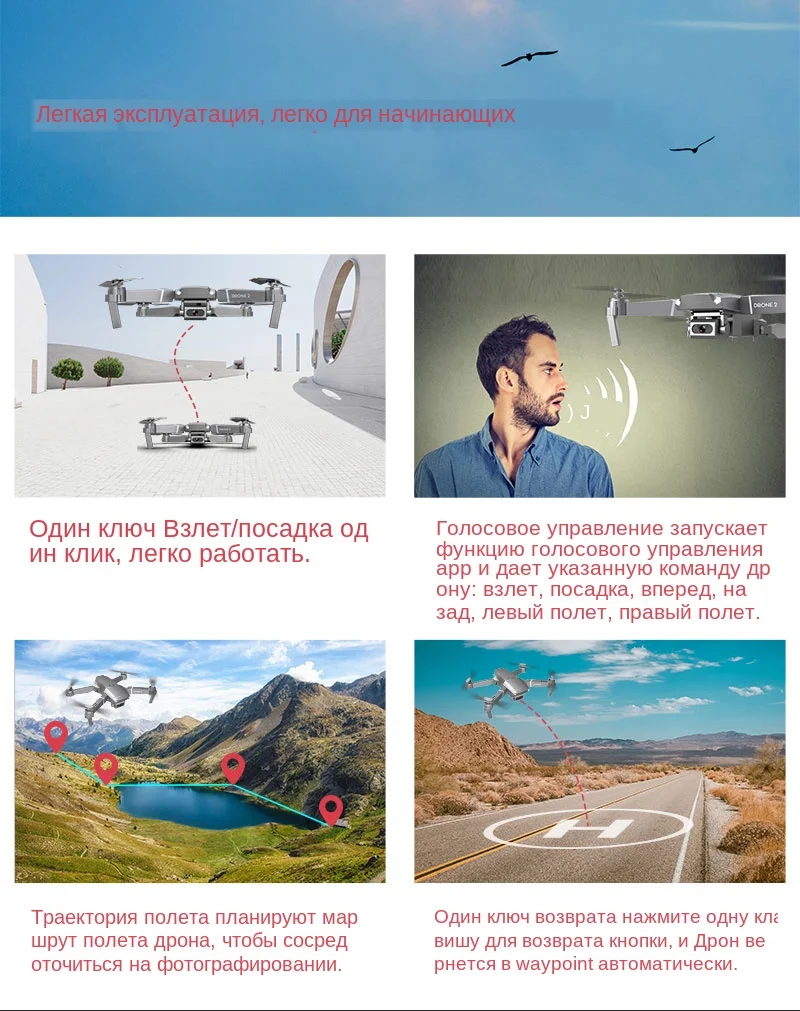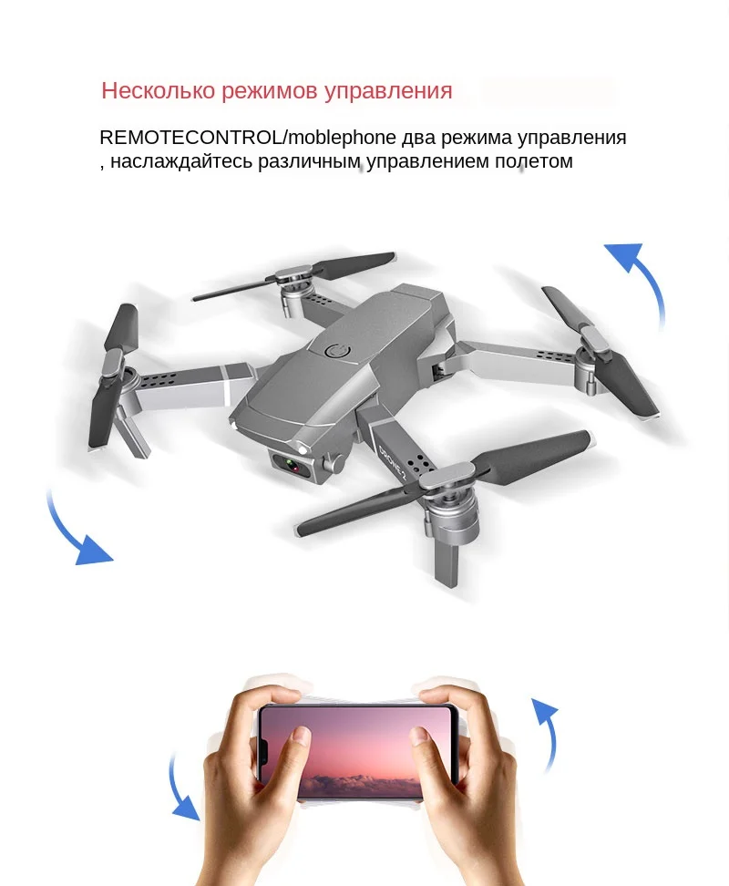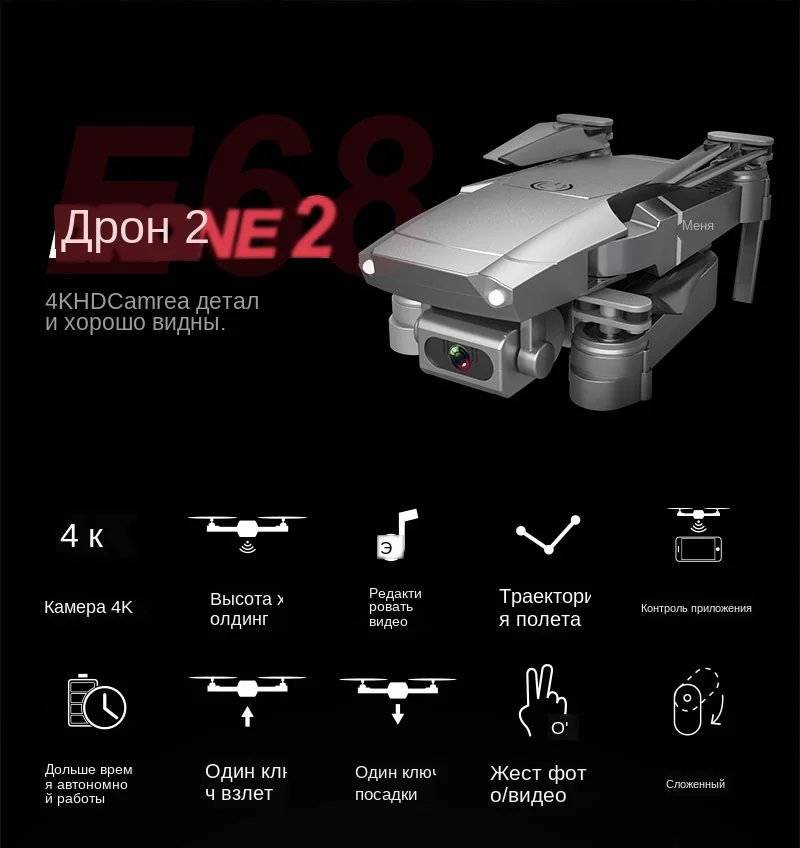 Особенности: -С складной ручкой, он маленький и легко носить с собой. -Имеет высокую функцию режима удержания для обеспечения стабильного полета. -С функцией Wi-Fi вы можете подключиться к APP, системе APK для съемки фотографий, видео и передачи изображений в режиме реального времени через камеру мобильного телефона. -С режимом отслеживания полета. Вы можете выбрать нужный вам путь. -С жестами, чтобы сделать фотографии. Mv функции воспроизведения музыки. -Есть 3 камеры на выбор. Оснащен широкоугольной камерой 720 P/1080 P/4 K для широкого спектра фотографий и видео высокой четкости. -Нет режима головы, нет необходимости регулировать положение самолета перед полетом. -Благодаря функции возврата одной кнопкой вы легко сможете найти свой путь домой. -Защита от помех использует технологию 2,4 ГГц. -4 канала, которые могут быть подняты, опущены, перенаправлены, удалены, Левши, правши и 360 ° свернуты. -Шестиосевой гироскоп для более стабильного полета и легкого управления. -Четырехроторный корпус изготовлен из высокопрочного и инженерно-стойкого пластика, легкий и прочный.