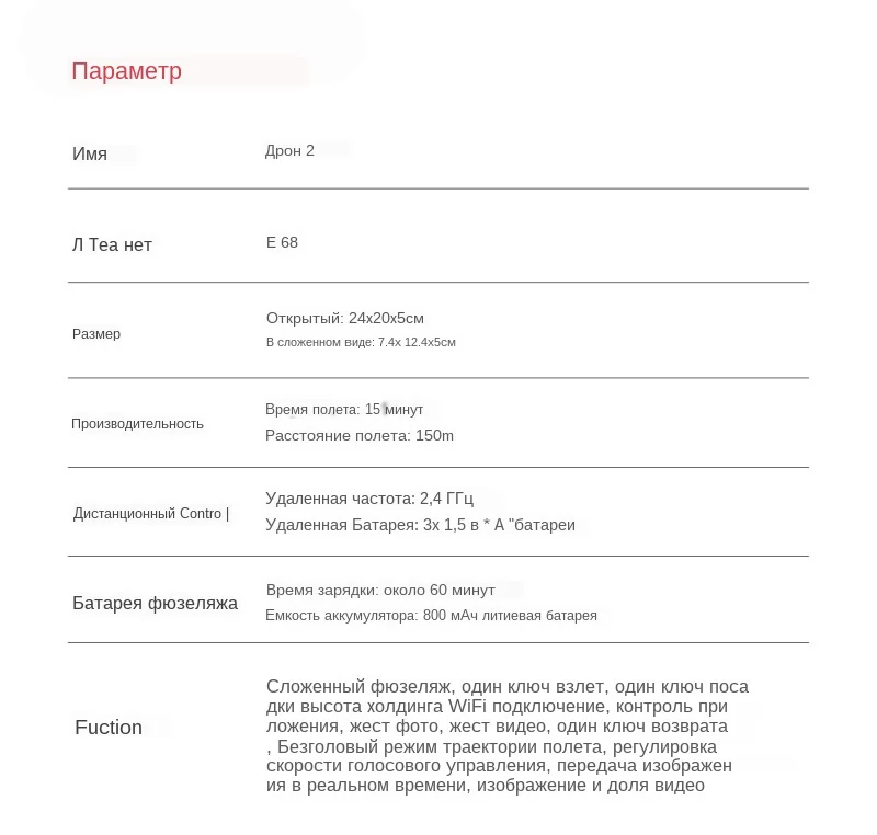 Головной изготовитель No.: E68 Частота: 2,4G Канал: 4ch Гироскоп: 6 A XIS Аккумулятор квадрокоптера: 3,7 в 800 мАч литиевая батарея (входит в комплект) Батарея передатчика: 3 батарейки 1,5 AA (не входят в комплект) Время работы на одном заряде: 60-70mins Время полета: 10-15 минут Вес дрона: 94,8 г (с батареей) Расстояние дистанционного управления: 80-100 м Цвет: черный Камера: 720 P/1080 P/4 K Четырехсторонний Размер: 24*20*5 см (рука не сложена) 12*7*5 см (в сложенном виде) Размер упаковки: 22*17*6 см Посылка: 379 г