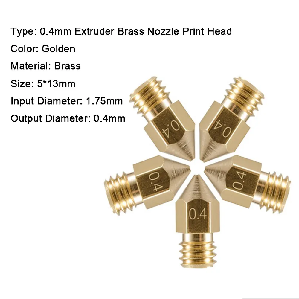 Тип: 0,4 мм Экструдер латунная насадка печатающая головка Подходит для PLA/ABS/TPU Филамент с 1,75 мм диаметр Цвет: золотистого цвета. Материал: цинковый сплав Вход Диаметр: 1,75 мм Выход Диаметр: 0,4 мм Диаметр внешней резьбы: 6 мм