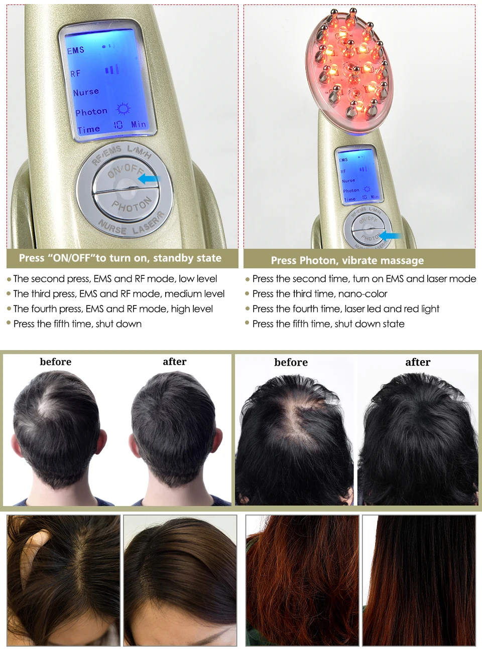 1.[Инновационная технология 7 в 1]Оборудование с 7 различными функциями: инфракрасный свет, низкочастотный лазер, нано красный свет, Электропорация, EMS микро-электричество, вибрационный массаж, и RF, которые могут полностью удовлетворить универсальные требования по уходу за волосами и решить различные проблемы с волосами, такие как выпадение волос, восстановление линии волос, расширение капиллярной трещинки, жирные волосы, поврежденные волосы, И многое другое.
