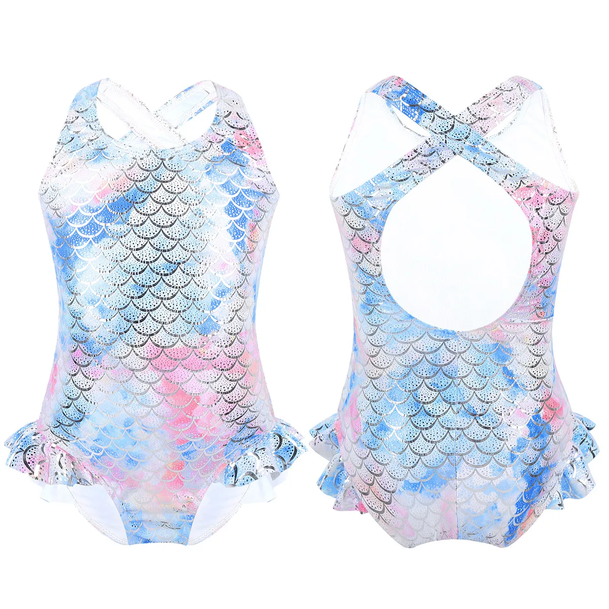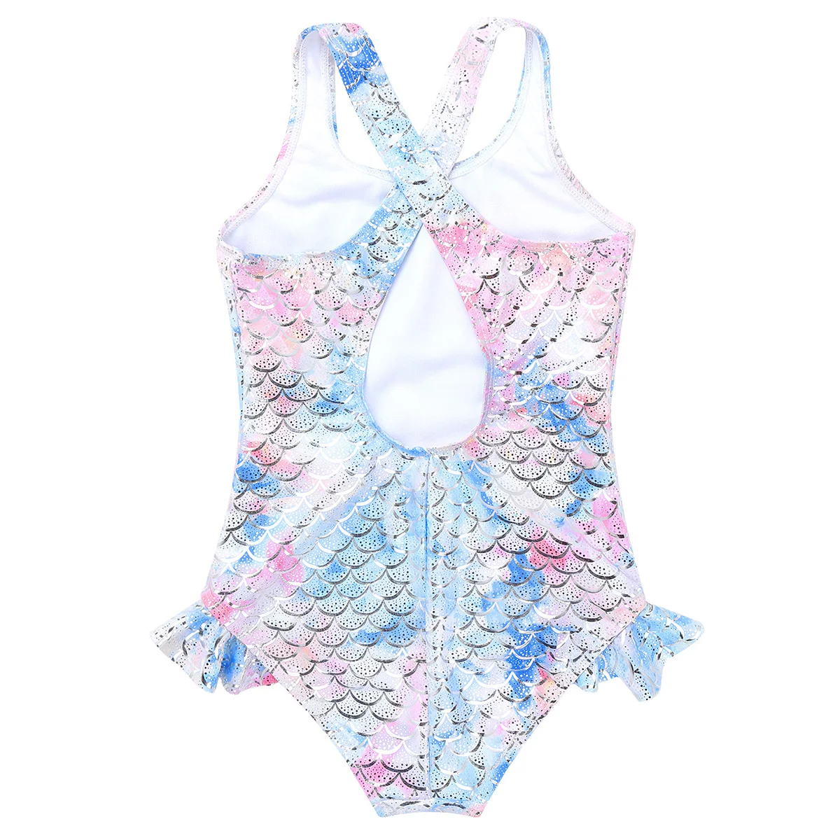 Без рукавов, крест-накрест на спине с вырезом, повторяющийся принт с блестящим рисунком рыбьей чешуи. Отверстия для ног украшены рюшами.