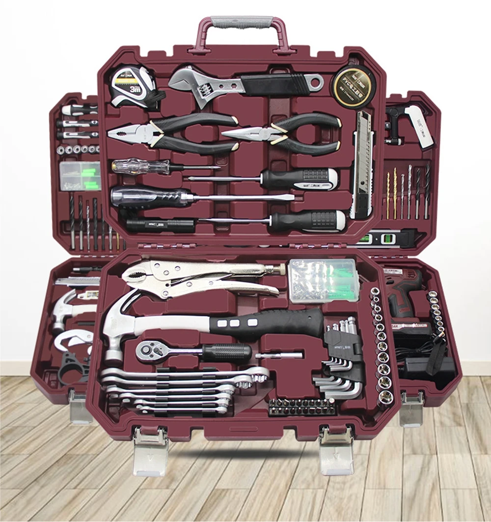 1 * рулетка 1 * разводной гаечный ключ 1 * изолента 1 * кусачки для проволоки 1 * резак 1 * электрическая ручка двойного назначения Отвертки PILLIPS 1*6X100 1*6X100 отвертки с плоским наконечником 1 * Ударная дрель 1 * Фонарик 1 * фиксирующие плоскогубцы 1 * коробка для деталей 1 * когтеточный молоток 9 * шестигранный ключ Розетки 11*1/4 (4-13 мм) Гаечные ключи с трещоткой 1*1/4 1 * магнитный стержень 6 * гаечный ключ 10 * бит