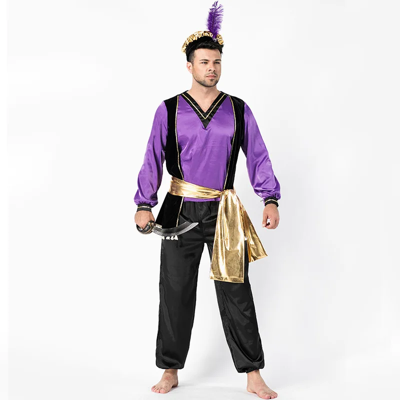 modname=ckeditor Men's Sultan Costume Explore a whole new world in this Men's Sultan costume featuring a purple satin tunic with gold and black hems, an attached black velvet vest with a gold tassel hem, black satin pantaloons, a gold satin sash, and a gold and black satin headpiece with purple feather accent and purple gem embellishment. Item Included