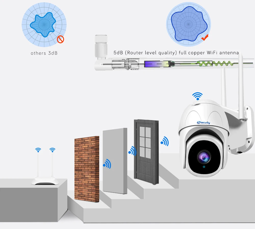 Камера zysafety с Wi-Fi PTZ имеет мощный Улучшенный уровень маршрутизатора 5 дБ, полностью медная антенна с ядром, также поддерживает режим точки доступа, вам больше не придется лазить высоко, чтобы получить карту или соединительный кабель.