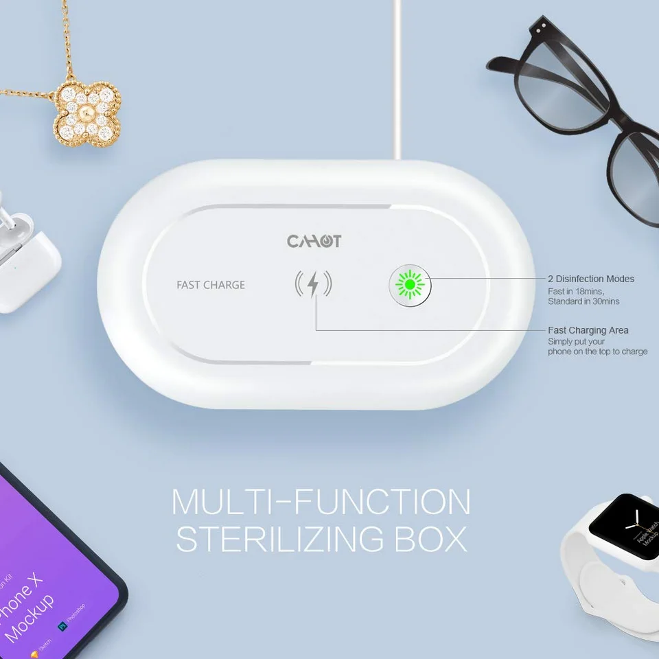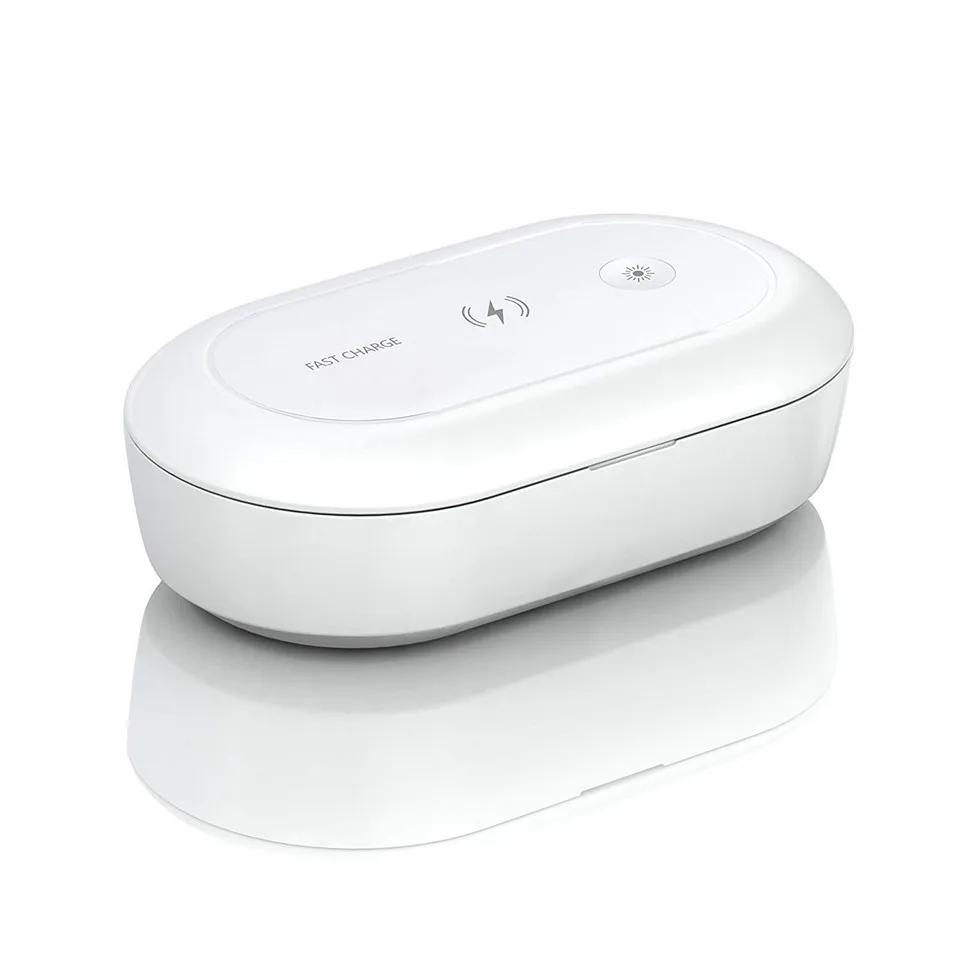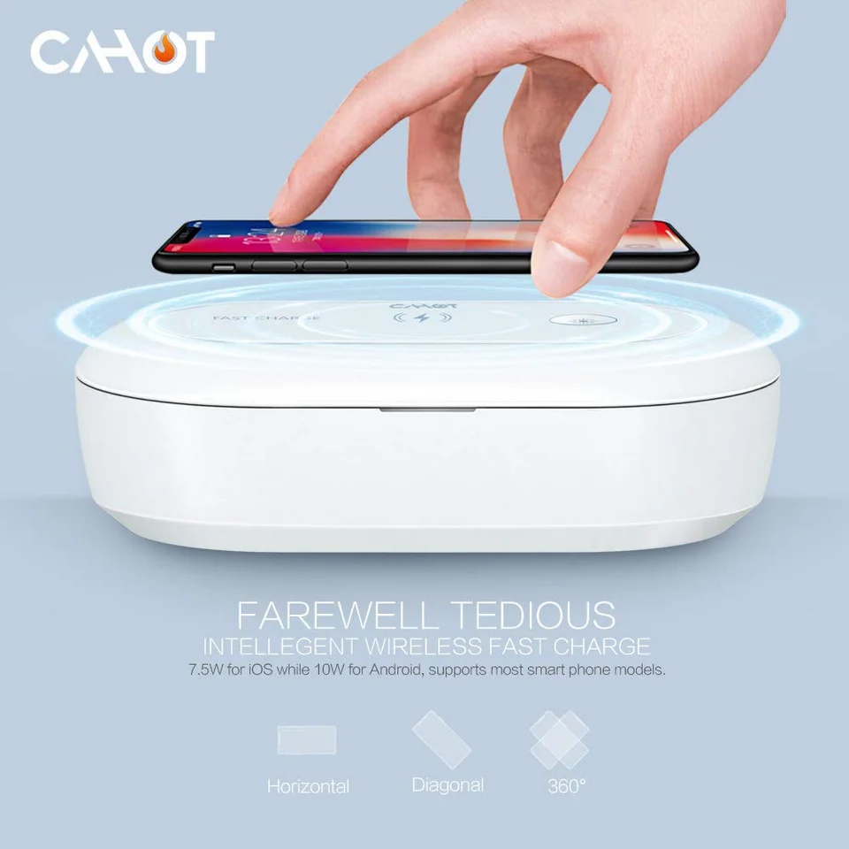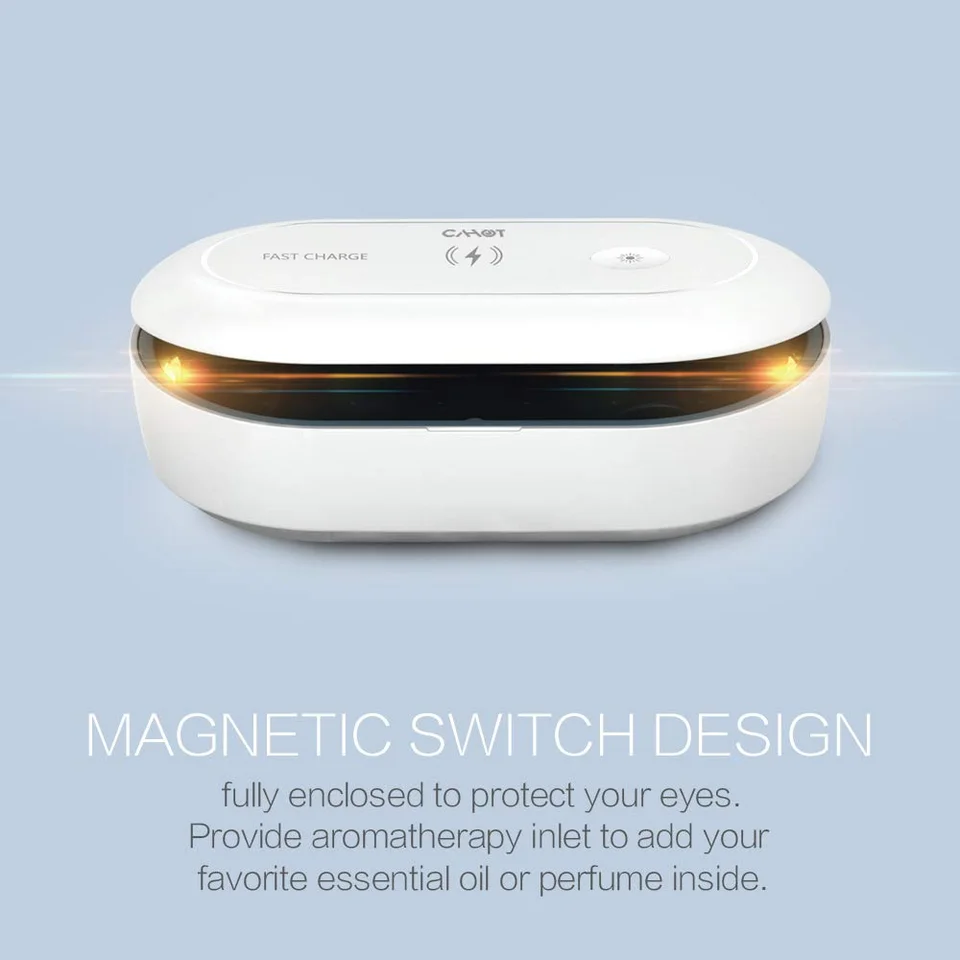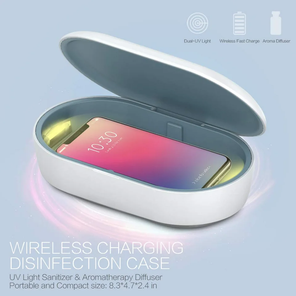 Дизайн 3 в 1: 1, дезинфекция от ультрафиолета + озона; 2, встроенная беспроводная зарядная панель, Быстрое беспроводное зарядное устройство, совместимое с iphone, samsung и другими смартфонами с функцией беспроводной зарядки; 3, функции ароматерапии: впрысните эфирное масло для ароматерапии в вход для ароматерапии, Возьмите свои телефоны или другие персональные предметы, чтобы иметь спа-салон для ароматерапии.