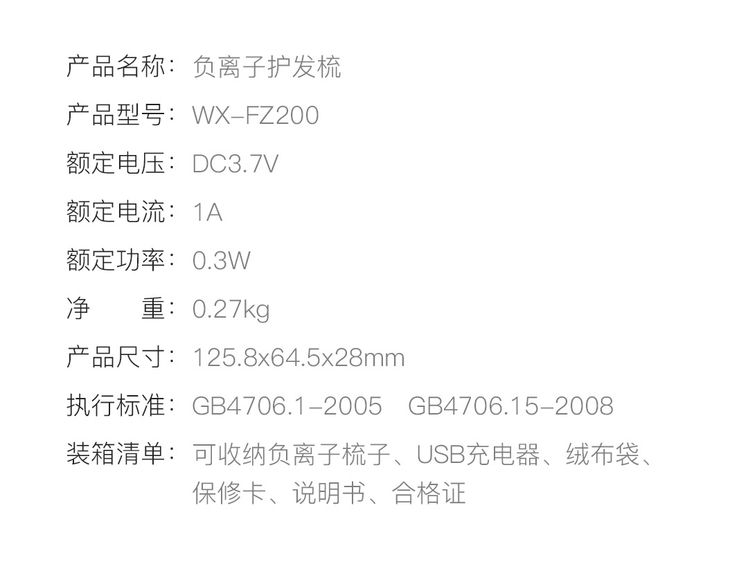 Глубокий ионный генератор, активная ионная Блокировка новой технологии. Складная конструкция для хранения, легко отделяется и легко переносится. Проводная система обновляет Тип зарядки, длительный срок службы батареи. Автоматическое выключение после зарядки/забора воды. Эргономичная и удобная ручка на ощупь. Параметры: Бренд: wellskins Тип: WX-FZ200 Цвет: белый Номинальное напряжение: DC3.7V Номинальный ток: 1A Номинальная Мощность: 0,3 W Вес и размер: вес изделия: 0,27 кг Посылка Вес: 0,38 кг Размер продукта (Д x Ш x В): 6,45x2,8x12,58 см Упаковочный лист: 1 x ионная расческа 1 зарядное устройство USB 1 х бархатная сумка 1 x Руководство пользователя
