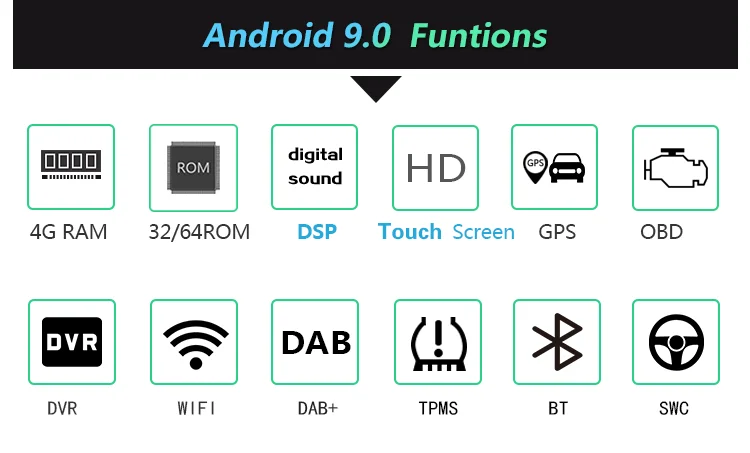 Система Android 9,0 DSP car audio Пиксель экрана: 1280*480 IPS ОС: Система Android 9,0 CPU: Rockchip PX6(3399) Cotex A72 (1,8 ГГц) + A53 (1,4 ГГц), 6 ядер Основная мощность: 1,5 ГГц Оперативная память: SAMSUNG 4 ГБ DDR3 Nand Flash : 32 ГБ Емкостный сенсорный экран GPS + радио + AUX IN + DVR + Простое подключение BT 5,0 (подключение к Интернету через BT, 3 способа вызова) AHD вход камеры заднего вида 4 + 32 ГБ/4 + 64 ГБ, Поддержка AHD (аналоговая камера высокой четкости), Радио: TEF6686 Встроенный DSP Встроенный carplay и android auto , (опционально)