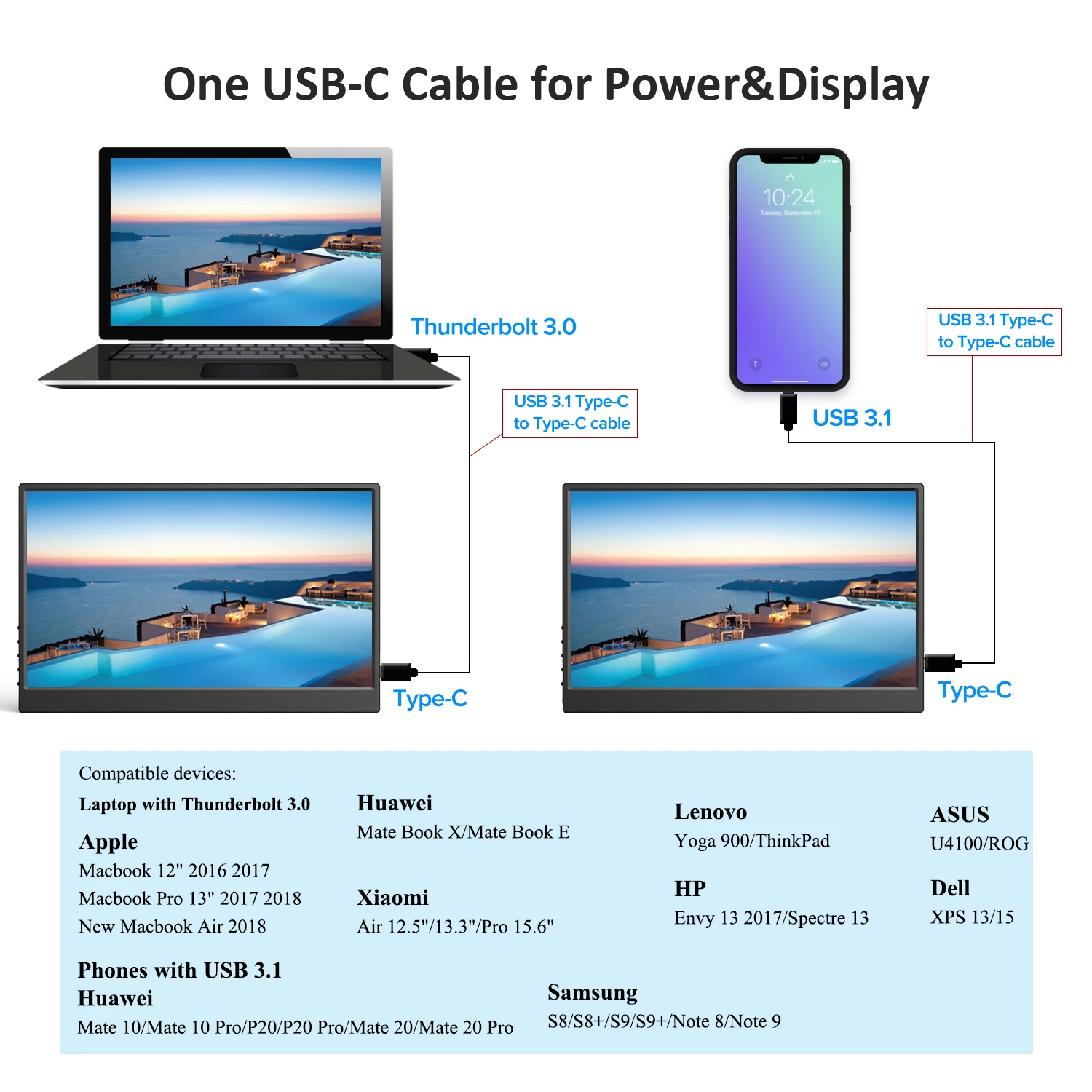 Соединение с одним USB-C Для ПК: Поддержка thunderbolt 3. E.g. Apple Macbook 12 "2016/Macbook 13" 2017/Новый Macbook Air 2018. Huawei Mate Book X/Mate Book E.Xiaomi Air 12,5 "/13,3"/Pro15.6.Lenovo Yoga 900/ThinkPad. HP Envy 13 2017 /Spectre 13.ASUS U4100/ROG.Dell XPS 13/15 Для телефона: Поддержка USB 3,1. E.g.Huawei Mate P30/P30 Pro/Mate P20/P20 Pro/Mate 10/10 Pro.Samsung S9/S9 +/S8/S8 +/Note 8/Note9 Feasture Не более тонкая граница, чем UPERFECT Monitor: чрезвычайно узкая граница: увеличение визуального диапазона и пропорции экрана к монитору, усиление визуального шока Полностью алюминиевый сплав с ЧПУ: используется лучший полностью алюминиевый сплав с ЧПУ + Оригинальный ЖК-экран, по сравнению с пластиковой рамой, железной рамой и нижним ЖК-дисплеем (низшие материалы используются для снижения затрат).UPERFECT 13,3-мониторов фактический противоударной защитой и прослужат дольше Кожаный чехол-подставка: Винтовая кобура подходит для 2 настенных отверстий дисплея. Используется для защиты продукта от повреждения и царапин до тех пор, пока два шага завинчивания Plug & play: без конвертера или программного обеспечения, примечание для передачи сигналов с HD или Type-C после включения Встроенные динамики: Гав блок с усиленными бумажным диффузором и 3,5 мм для наушников, предоставляют реальные и стереоскопический gamimg мира 72% NTSC:72% цветовая гамма восстанавливает истинный цвет и 8 миллионов динамических контрастностей делают цвет более ярким, чем обычный монитор 85% Параметры Экран Размер: 13,3 дюймов Разрешение: 1920*1080 Материал: алюминиевый сплав с ЧПУ + Оригинальный ЖК-экран Экран границы: 0,12 дюймов Цветовая гамма: NTSC72 % Время отклика: 3-5(Tr + Td)ms Тип панели: IPS (полный угол обзора 178 °) Соотношение экрана: 16:9 Тип подсветки: светодиодный Машина Размеры: 12*7,6 * 0.47in Вес: 1.4lb Посылка 1x13.3 ”монитор 1xкожаный чехол-подставка 1xHD шнур 1xUSB-C шнур 1xType-C шнур Адаптер 5 в 3 А-1 шт. 1 Руководство пользователя