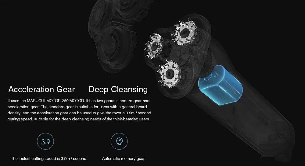 Это стандартный механизм подходит для пользователей с общим плотностью бороды и ускорение передач может использоваться для того, чтобы дать бритву 3,9 м/сек скорость резки, подходит для глубокого очищения толстых бородатых пользователей.