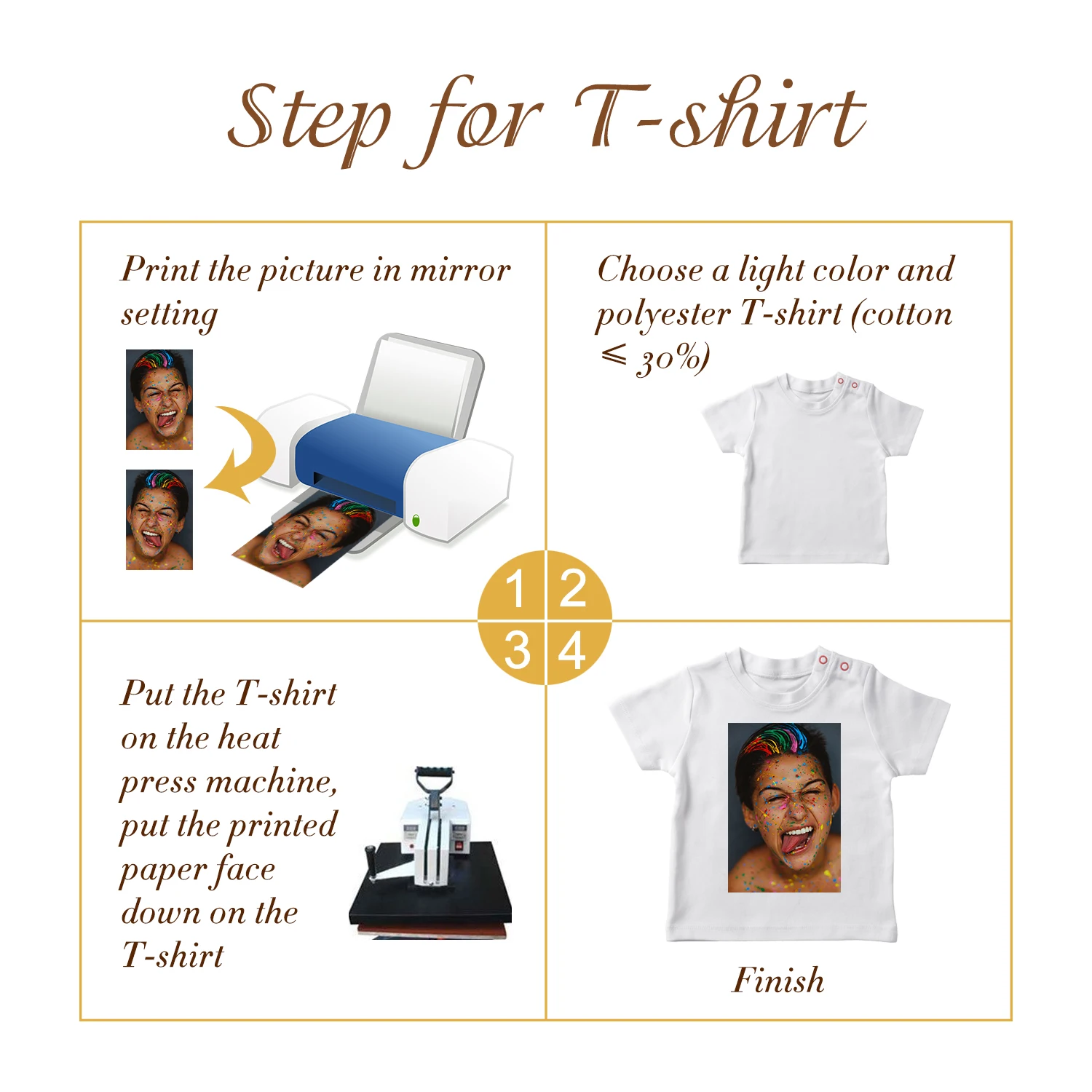 Бренд: Hemudu Наименование: Сублимационная бумага для переноса Размер: A4 (210 мм * 297 мм) Количество листов: 10 листов Вес: 105 г Применимые чернила: EPSON, Saugrass,OEW сублимационные чернила Применимые принтеры: все цветные струйные принтеры, такие как Epson, HP, Canon, Brother