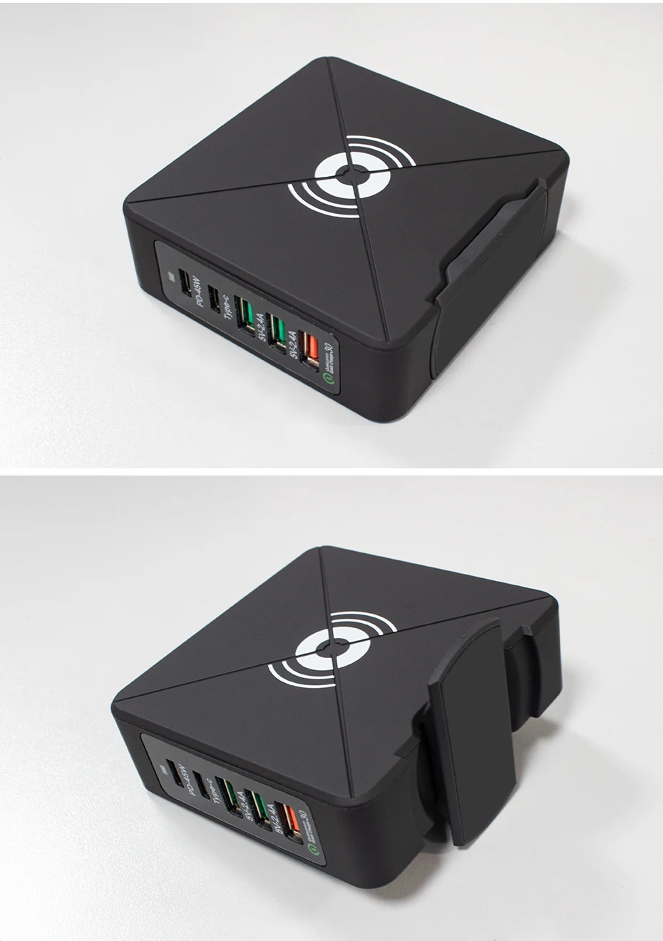 The quick charger owns one PD-45W slot, one Type-c slot, two USB slots and one fast charging slot, which can suffice different charging cable interface needs and several digital device charging at same time.
