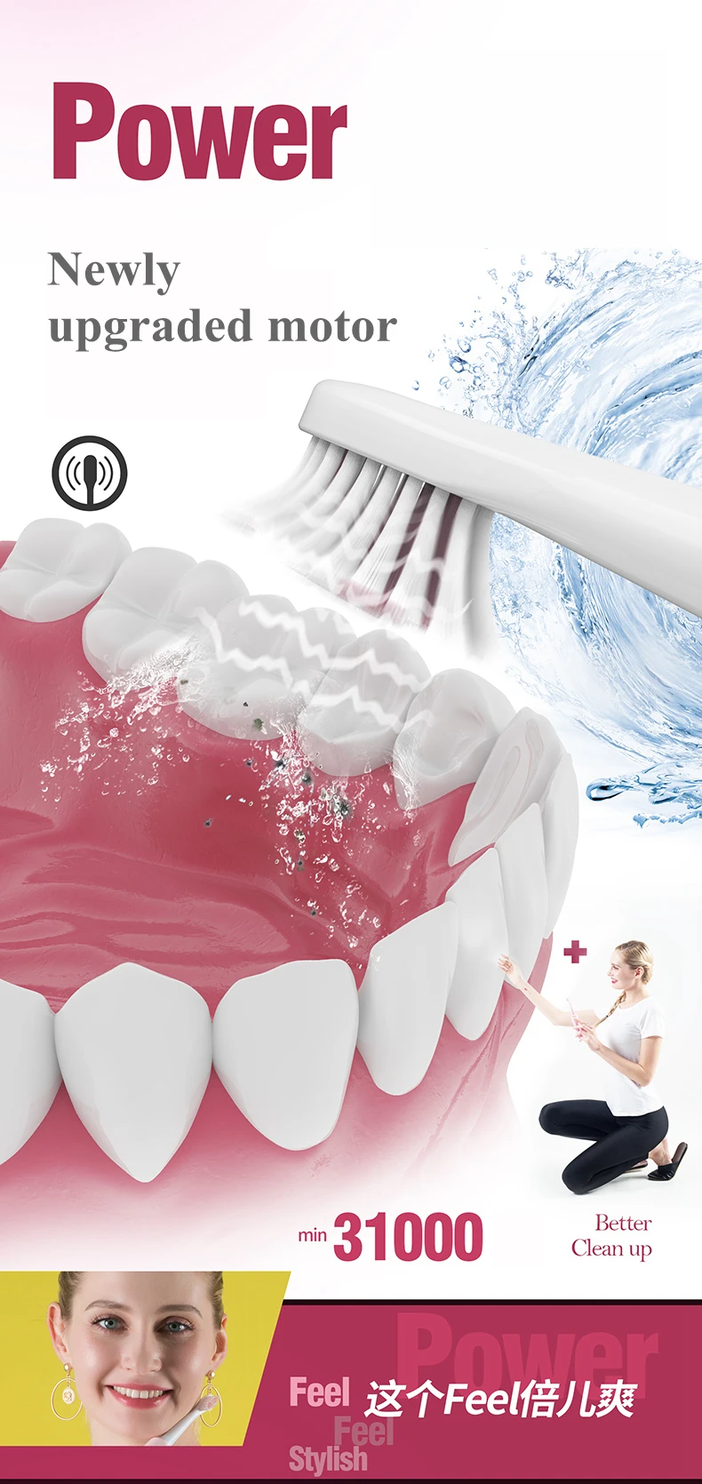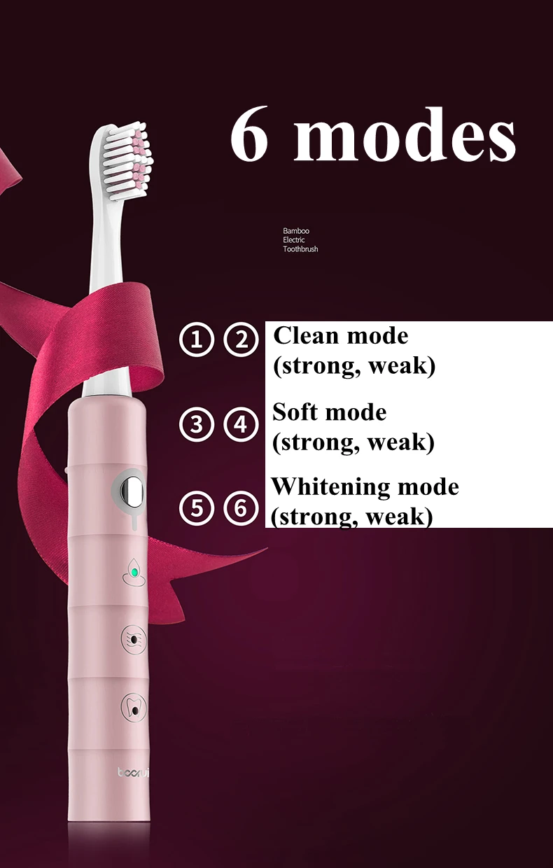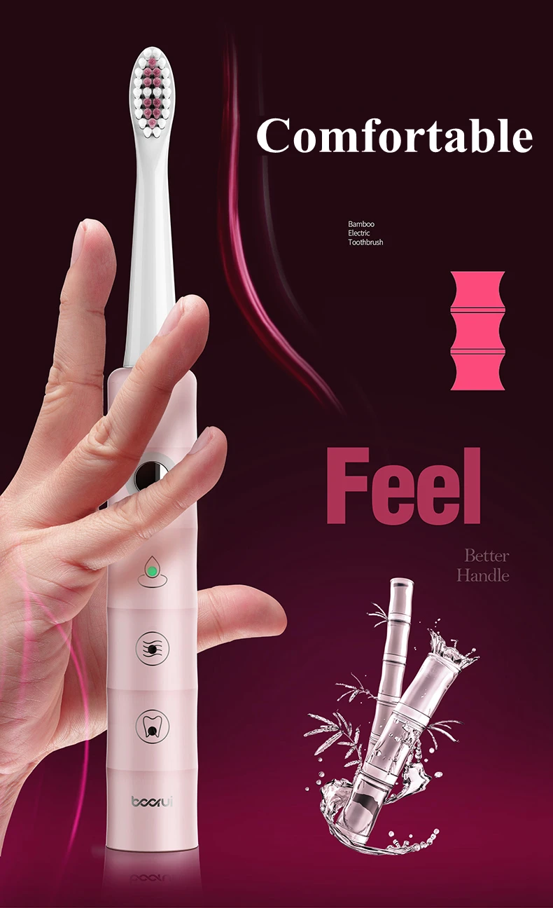 Название продукта: электрическая зубная щетка boorui Sonic Материал головки зубной щетки: DuPont Класс водонепроницаемости: IPX7 Децибел: менее 50 дБ, очень тихий Частота вибрации: 31000 раз/мин Время зарядки: 4-6 часов Время работы: 2 раза в день, может длиться более 4 недель Параметры зарядки: DC5V, 130mA Режимы очистки: A. Чистый B. Белый C. Десен Преимущество: 2 минут смарт-таймер 30 секунд напоминания об остановке Предотвращения кариеса Чистый и отбеливания зубов Свежее дыхание улучшает здоровье десен Высокая скорость звуковых волн В 6 раз чище, чем ручная Чистка США DuPont материал Зубная щетка головка, комфорт и не повреждает зубы 3 года, дизайн с передовой технологией Массажная электрическая зубная щетка, наслаждайтесь чисткой зубов. Комплектация: 1. Ручка зубной щетки * 1 2. Головка зубной щетки * 4 3. USB кабель зарядного устройства * 1