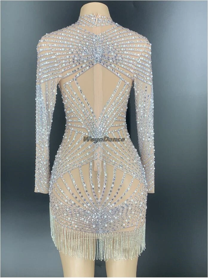 Новый серебряный стразы бахрома жемчужина прозрачные платья с длинными рукавами для женщин танцевальное шоу платье бар на день рождения Сетчатое вечернее платье