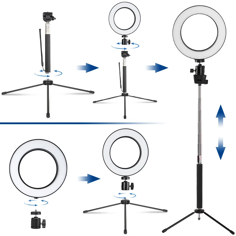 1 * светодиодный SMD кольцевой светильник 1 * шаровая Головка 1 * USB разъем 1 * селфи-палка 1 * Мини-Штатив 1 * Bluetooth затвор (пульт дистанционного управления только для телефона, не может управлять светильник) 1 * зажим для телефона