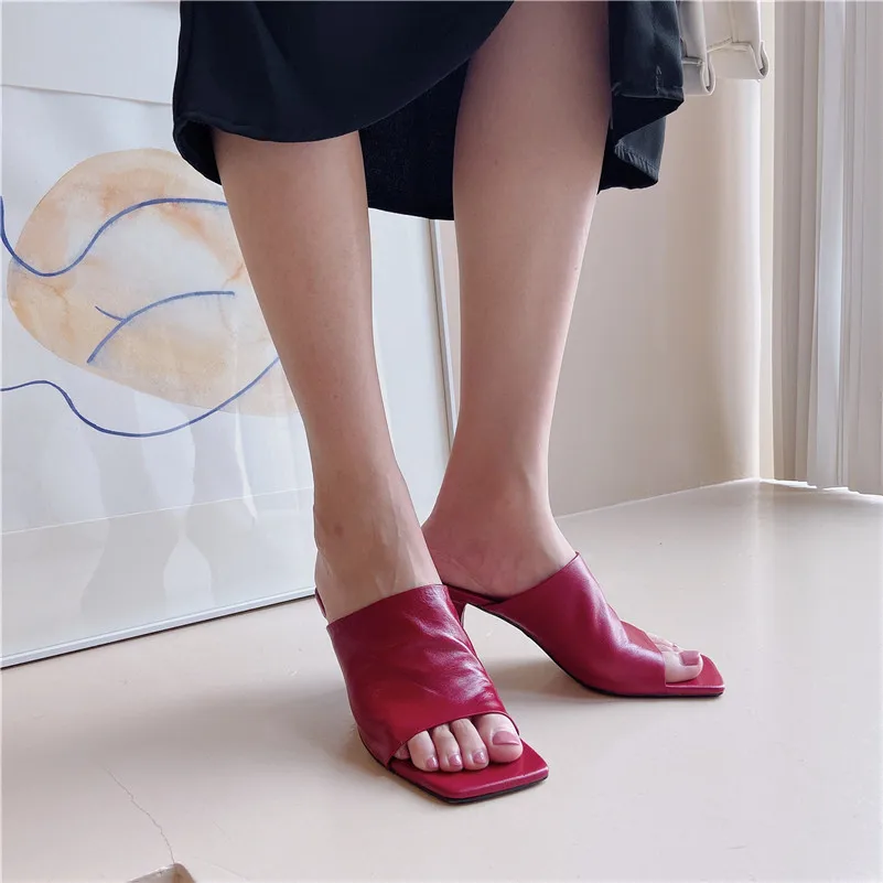 ANNYMOLI/женские туфли из натуральной кожи на высоком каблуке; Шлепанцы с квадратным носком; Женские босоножки на шпильке; Цвет Черный; Большие размеры 10,5