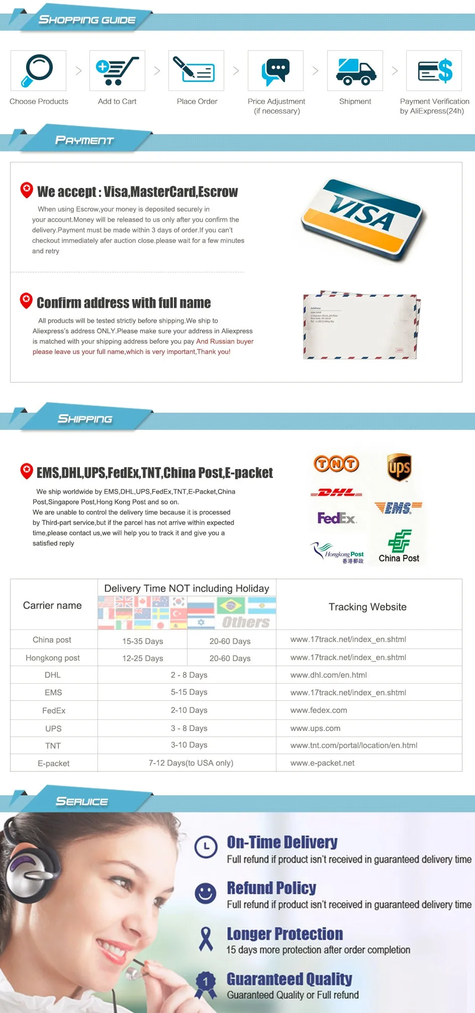 1. Если есть какой-либо продукт, нет номера отслеживания, продукт не получен, явление повреждения и т. д. пожалуйста, свяжитесь с нами вовремя, мы поможем вам решить проблему. 2. Чтобы облегчить вашу следующую покупку, вы можете подписаться на наш магазин, стать поклонником или добавить список желаний.
