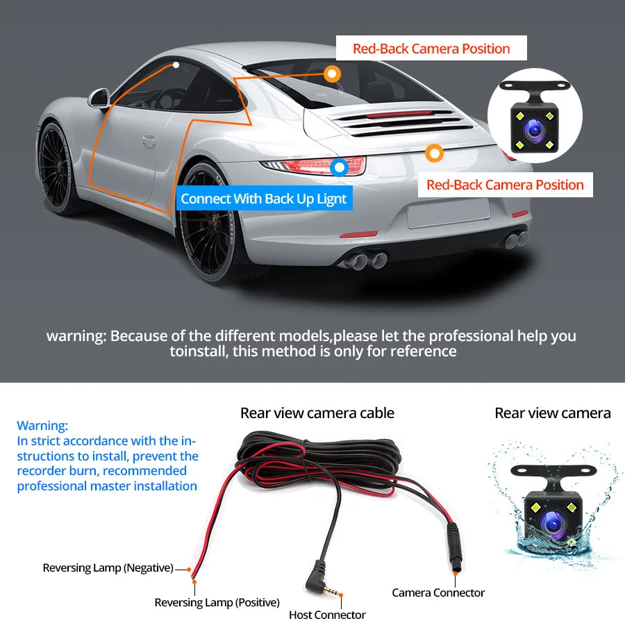 Пожалуйста, подключите красный кабель задней камеры с положительным полюсом питания обратной лампы автомобиля (+). А затем Подключите автомобильное зарядное устройство к прикуривателю для питания автомобильного видеорегистратора. Когда вы получите свой автомобиль в обратном направлении, Автомобильный видеорегистратор автоматически переключается на заднюю камеру с помощью линии парковки. Затем будет работать функция автоматического реверса.