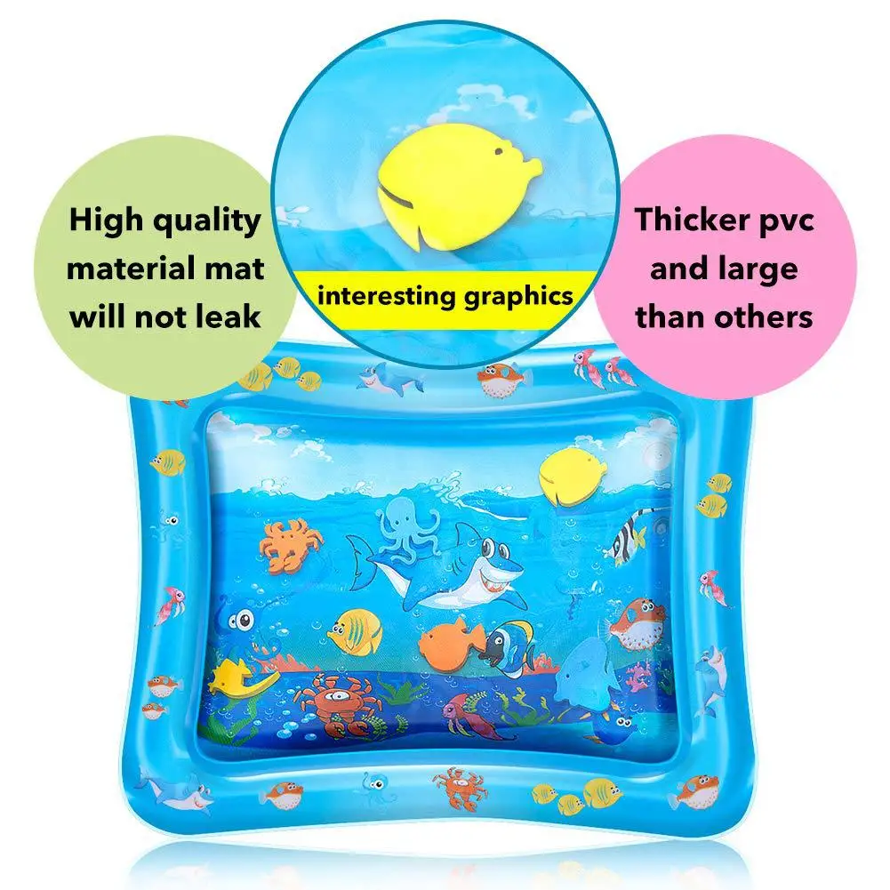 Особенности: 1. Это надувная водная подушка, игровая игрушка для ребенка. 2. Он изготовлен из толстого пвх материала и герметичен, чтобы ребенок не промокал во время игры на воде. 3. Центр активности во время животика помогает укрепить спину, ноги, руки и шею ребенка. 4. Детский игровой коврик из плотного ПВХ не пропускает воздух или воду. 5. Ребенок нажимает водный коврик и перемещает рыбу вокруг, чтобы повысить координацию рук и глаз. 6. Коврик для животика отлично подходит для сенсорной стимуляции, моторики, когнитивных способностей и социальных навыков. 7. Просто заполните коврик водой и надуйте край воздухом, дети могут иметь часы тактильного и визуального удовольствия. Технические характеристики: Цвет: синий Материал: ПВХ пластик Цвет изделия: A, B, C Размер изделия: около 60-50 см/23,62-19,69 дюйма Примечание: В связи с различиями мониторов и эффектами освещения реальный цвет товара может немного отличаться от цвета на фотографиях. Спасибо! Обратите внимание, что допускается отклонение в диапазоне 1–3 см из-за проведения замеров вручную. Посылка включает: 1 надувной игровой коврик для младенцев