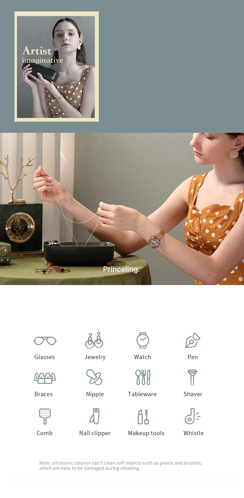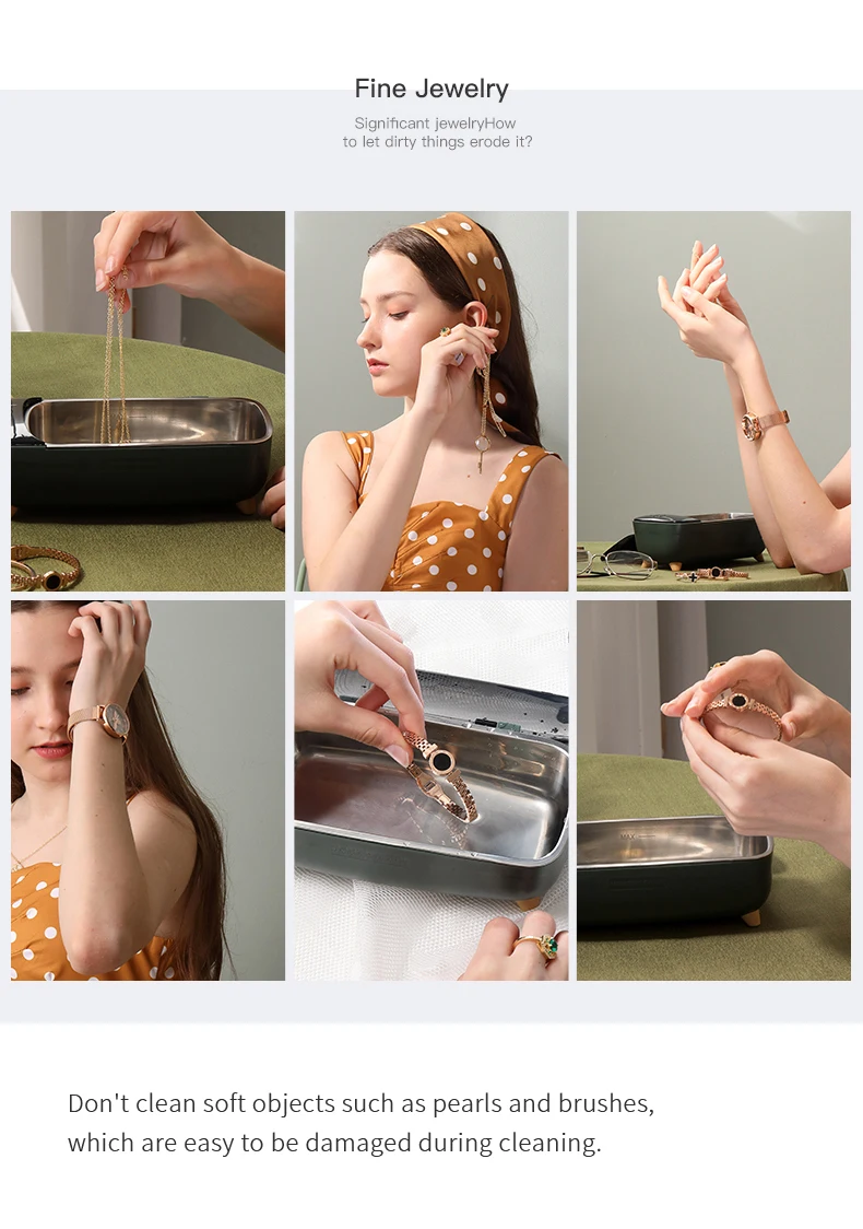Примечание: ультразвуковой очиститель не может очищать мягкие предметы, такие как жемчуг и кисти, которые легко повредить во время чистки.