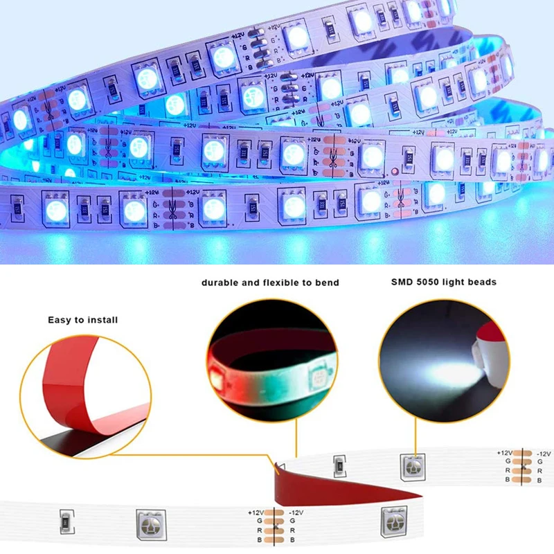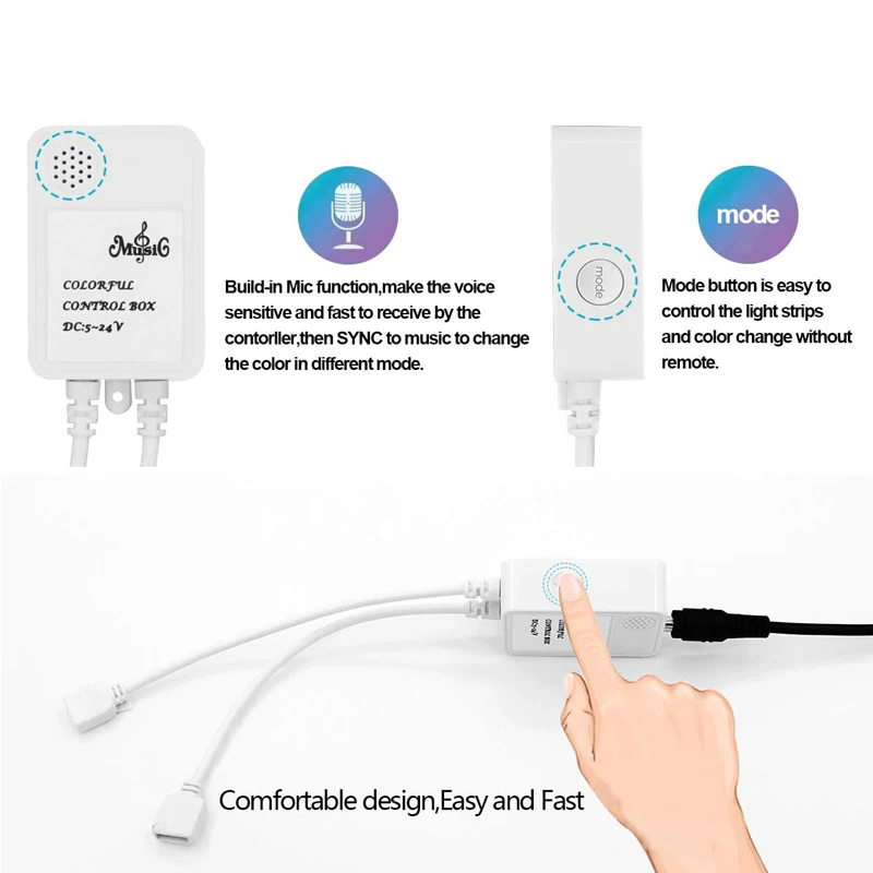 1. Благодаря встроенному высокочувствительному микрофону этот светильник может слушать и танцевать под окружающую музыку. Вы увидите, как он мигает и меняет цвет с помощью ударов! 2. Общая длина светодиодный светодиодные полосы света 5 м в рулоне. Супер яркие светодиоды SMD5050 RGB, изменяемые цвета, он используется для компьютера, электрического оборудования, шкафа, уголка, кемпинга и другого внутреннего/наружного освещения или украшения.