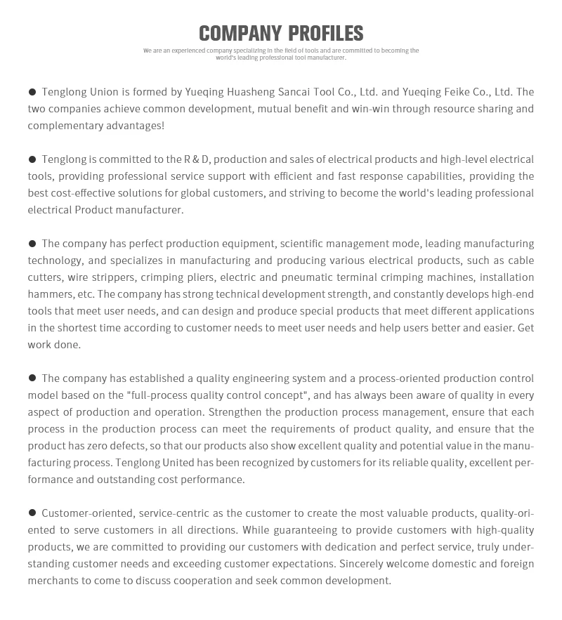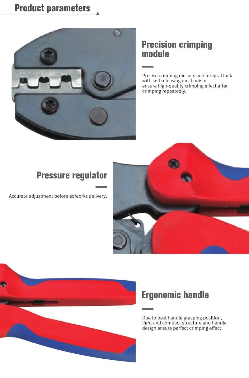 ■ Компоненты трещотки Обжимные Инструменты изготовлены из специальной стали. ■ Разработан в соответствии с инженерными факторами человека, он может сэкономить 50% Энергия при обжиме. ▪ Точные обжимные штамповки и интегральный замок с самостоятельным выпуском Механизм обеспечивает высокое качество обжима эффект после обжима Многократно. ■ Точная регулировка перед поставкой ex works.