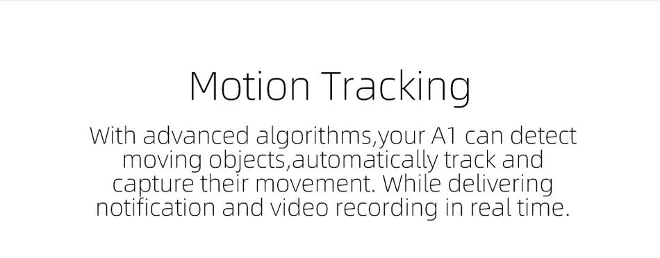 С помощью продвинутых алгоритмов, ваш A1 может обнаруживать движущиеся объекты, автоматически отслеживать и захватывать их движение. При доставке уведомлений и записи видео в реальном времени.