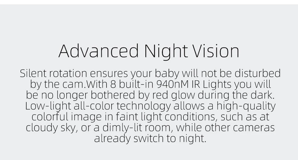 Бесшумное вращение вашего ребенка не будет беспокоить Камерой. С 8 встроенными 940nM ИК-лампами вы больше не будете беспокоить красное свечение во время темноты. С низким уровнем светильник all-цвет технология позволяет высокого качества красочные изображения в слабый светильник условия, как, например, на облачного неба, ora плохо освещённых комнаты, в то время как другие камеры уже переключатель в ночное время.