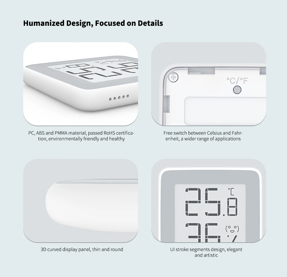 Этот чувствительный гигрометр от Xiaomi youpin может отображать влажность и температуру, обеспечивает точные данные. Устройство для считывания влажности указывает на текущее состояние воздуха, обеспечивает правильный контроль влажности, полезно для кожи, аллергенов и других проблем со здоровьем. Основные функции: • Различные воспоминания напоминания 6 видов комфорта напоминают о чувствах, милом и понятном дизайне, а также о том, что волнение позволяет вам понять комфорт, лучше ухаживать за здоровьем вас и вашей семьи. • Лучшее качество просмотра Электронный экран e-ink используется как экран дисплея, визуальный эффект от традиционной бумаги, и полный угол обзора виден. • Низкий расход энергии Встроенный аккумулятор CR2032 на 1 шт., до 1 года устойчивой работы и долговечности. • Широкое применение 3 вида размещения, подходят для различных сцен, таких как Цветочная комната, детская комната, спальня, ванная комната, кухня и т. д. • Экологически безопасные материалы Экологичный материал ПК, АБС, ПММА выбран, без вредных веществ. Он получил сертификат ROHS, что позволяет вам и вашей семье использовать его спокойно. Материал: АБС-пластик Посылка Вес: 0,113 кг Размер изделия (Д х Ш х В): 6,45x6,45x0,97 см/2,54x2,54x0,38 дюйм (ов) Посылка размеры размер упаковки (Д x Ш x В): 8,00x8,00x3,00 см/3,15x3,15x1,18 дюйм (ов) Посылка в комплект входит: 1 x термометром и гигрометром декоративные часы, 1 х база, 1 x Стикеры
