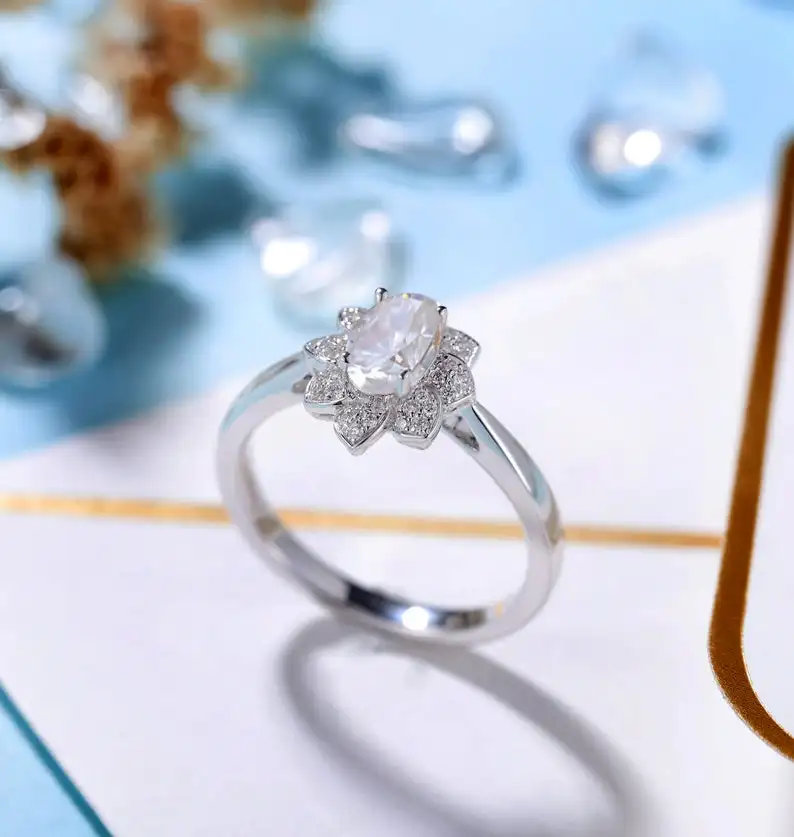 18k Белый Золотой центр 1ct 5*7 мм овальный вырез Moissanite Лотос образное обручальное кольцо обещающее кольцо для женщин