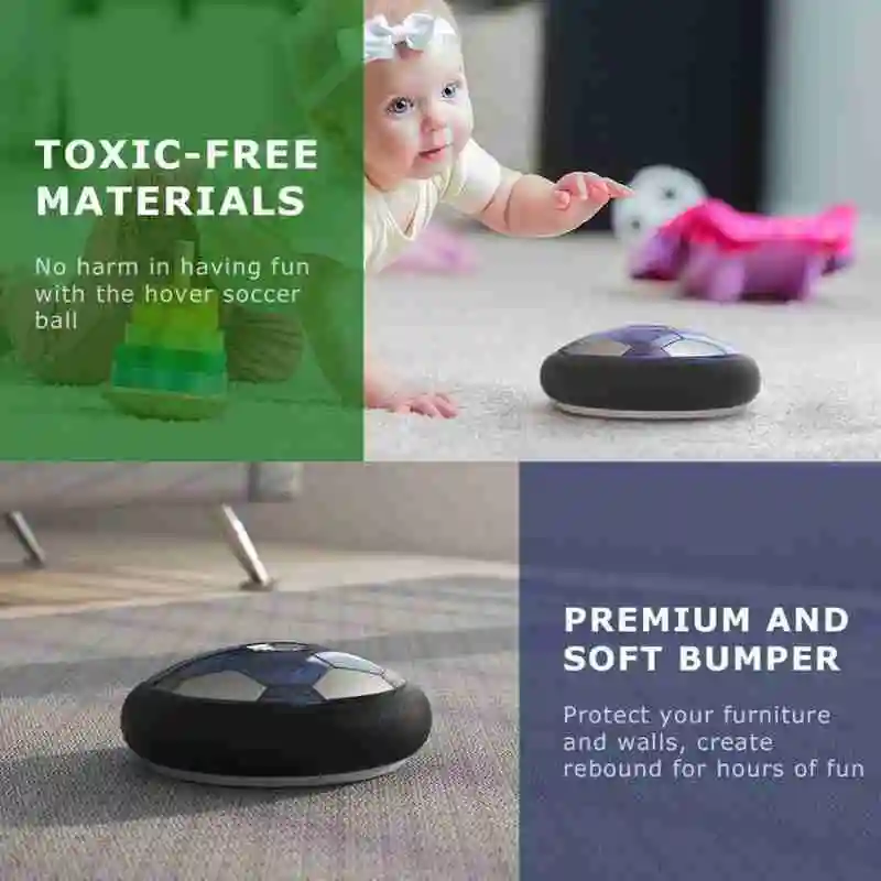 Внутренний и наружный-край диска имеет Премиум EVA бамперы и мягкие поролоновые прокладки, поэтому hover football-это замечательная и захватывающая игрушка, которую ваши дети могут играть в помещении, не беспокоясь о сломающихся стенах и мебели и неограниченном веселье от игр на открытом воздухе!
