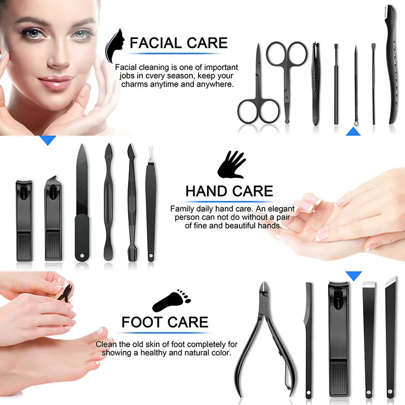 Наш набор для стрижки ногтей содержит 18 инструментов для удовлетворения всех ваших потребностей в уходе за руками, заботе о лице и ногах.
